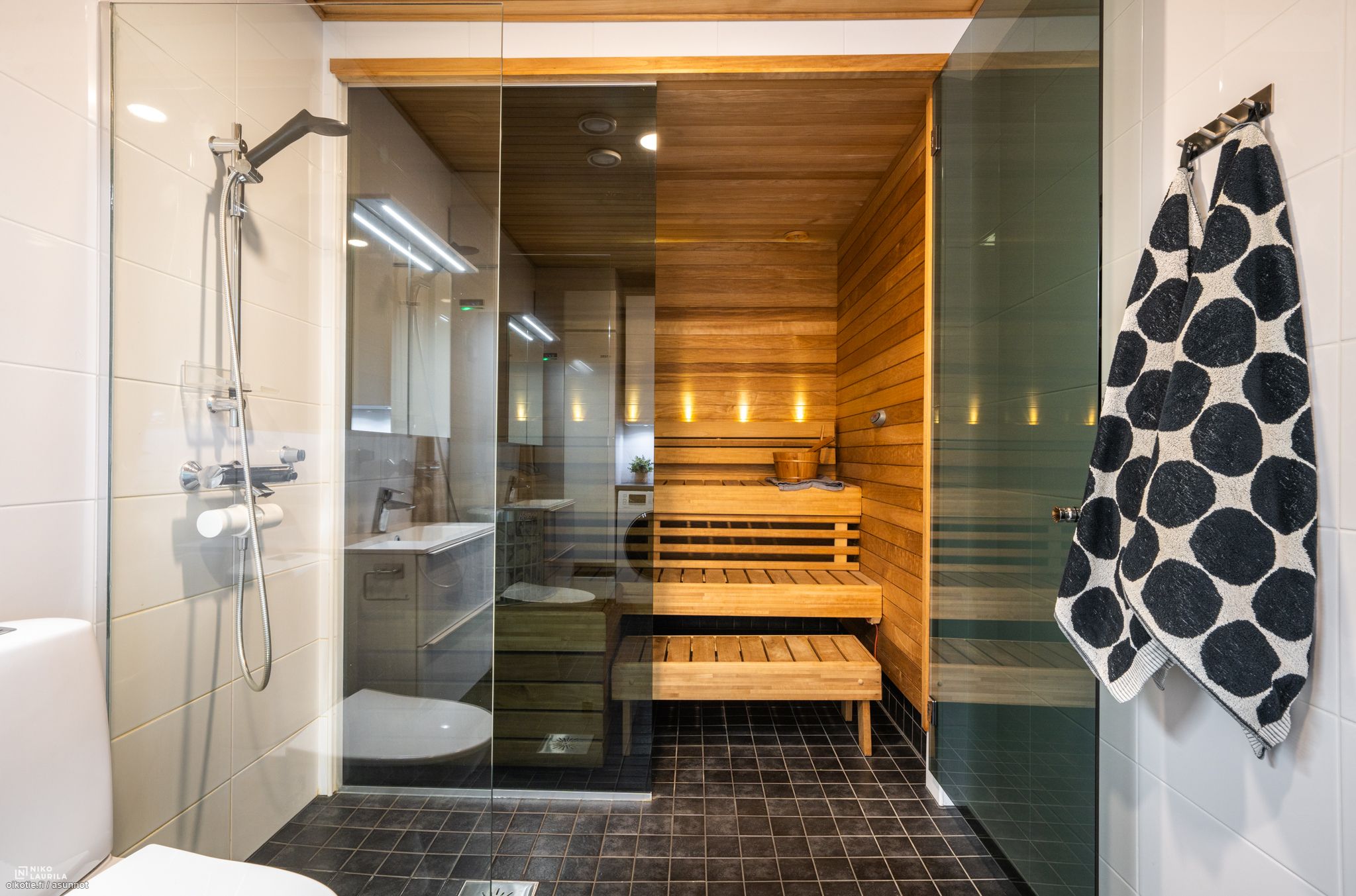 - Varusteet: Sähkökiuas, Lattialämmitys. Saunan lauteet lämpökäsiteltyä haapaa, LED-valot, lasiseinä kylpyhuoneen ja saunan välissä. Seinämateriaali: Paneeliseinä. Lattiamateriaali: Laattalattia