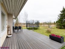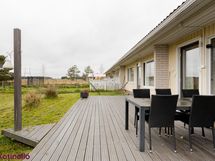 Lähes koko asunnon levyinen tilava terassi avautuu vehreälle pihalle, jossa kasvaa omanapuita ja marjapensaita.