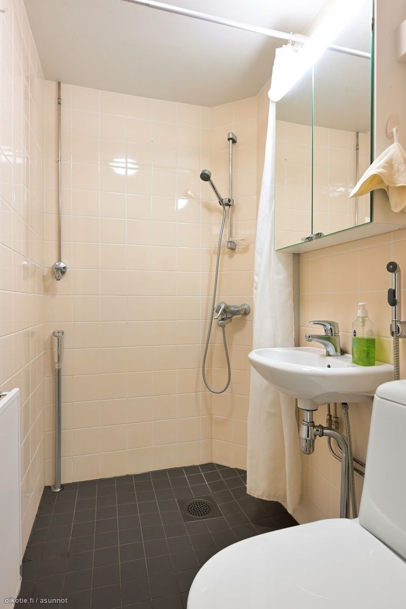 - Pesutilojen kuvaus: Kph: wc, lavuaari, peilikaappi, suihku, pesukoneliitäntä, suihkuseinä, joka ei ole tällä hetkellä asennettu paikalleen.