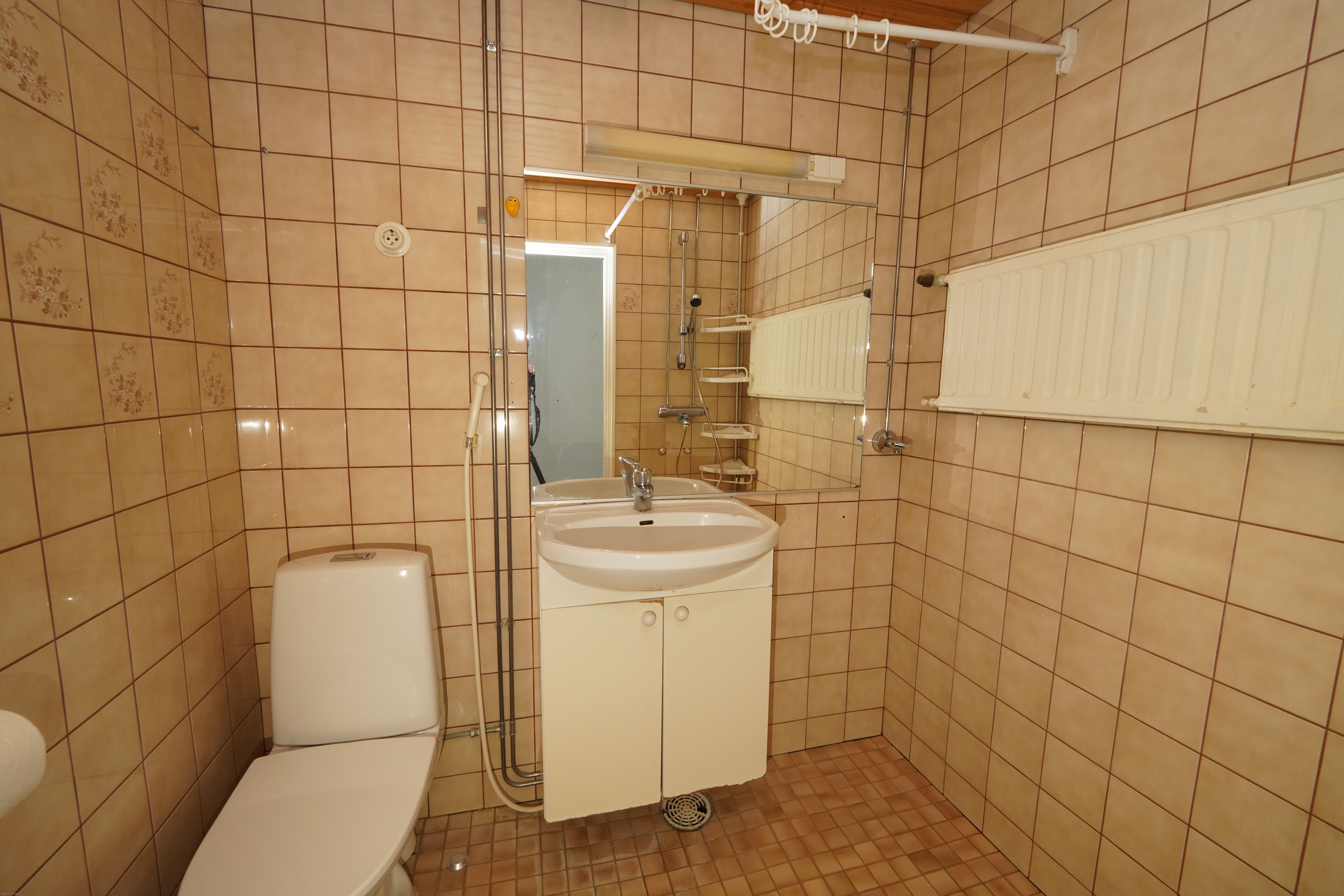 - Varusteet: Pesukoneliitäntä, WC, Suihku, Peili. pesuallas