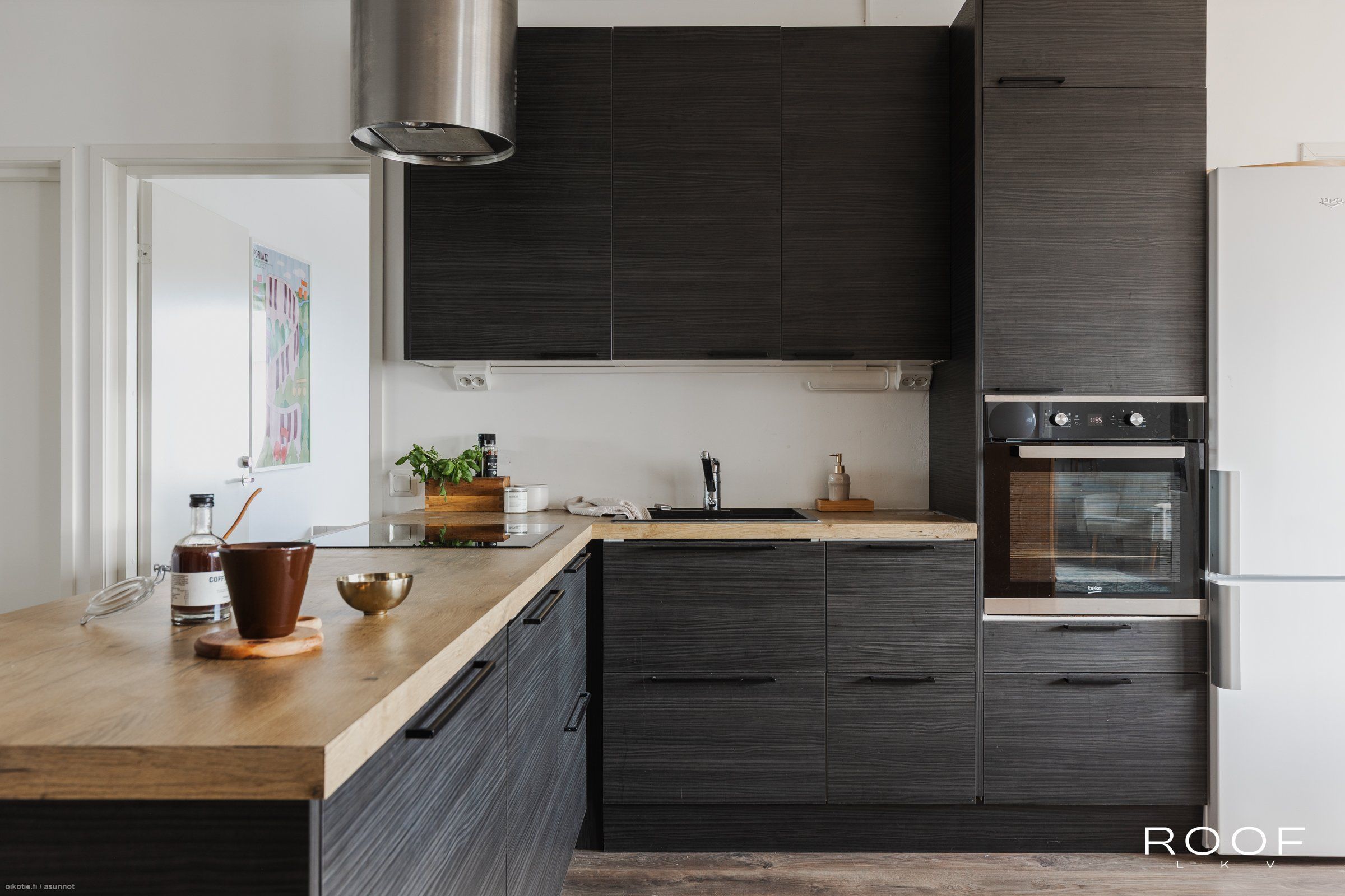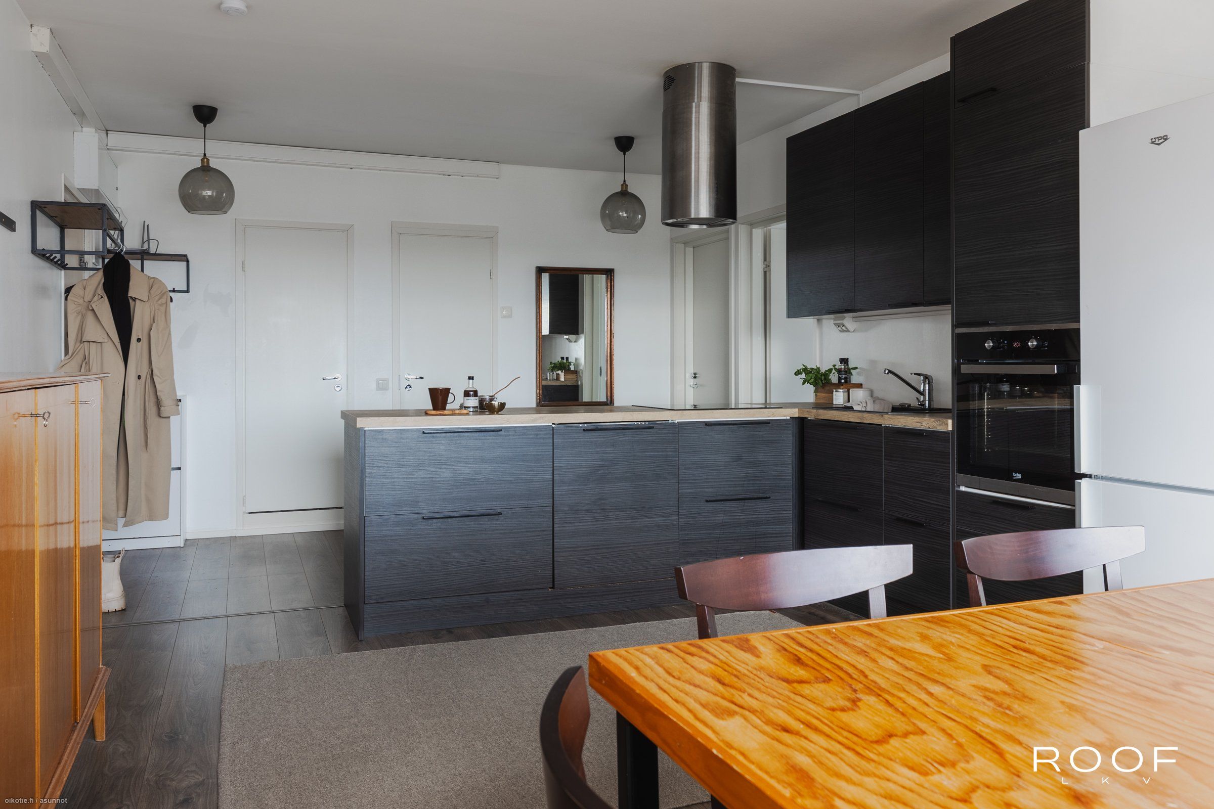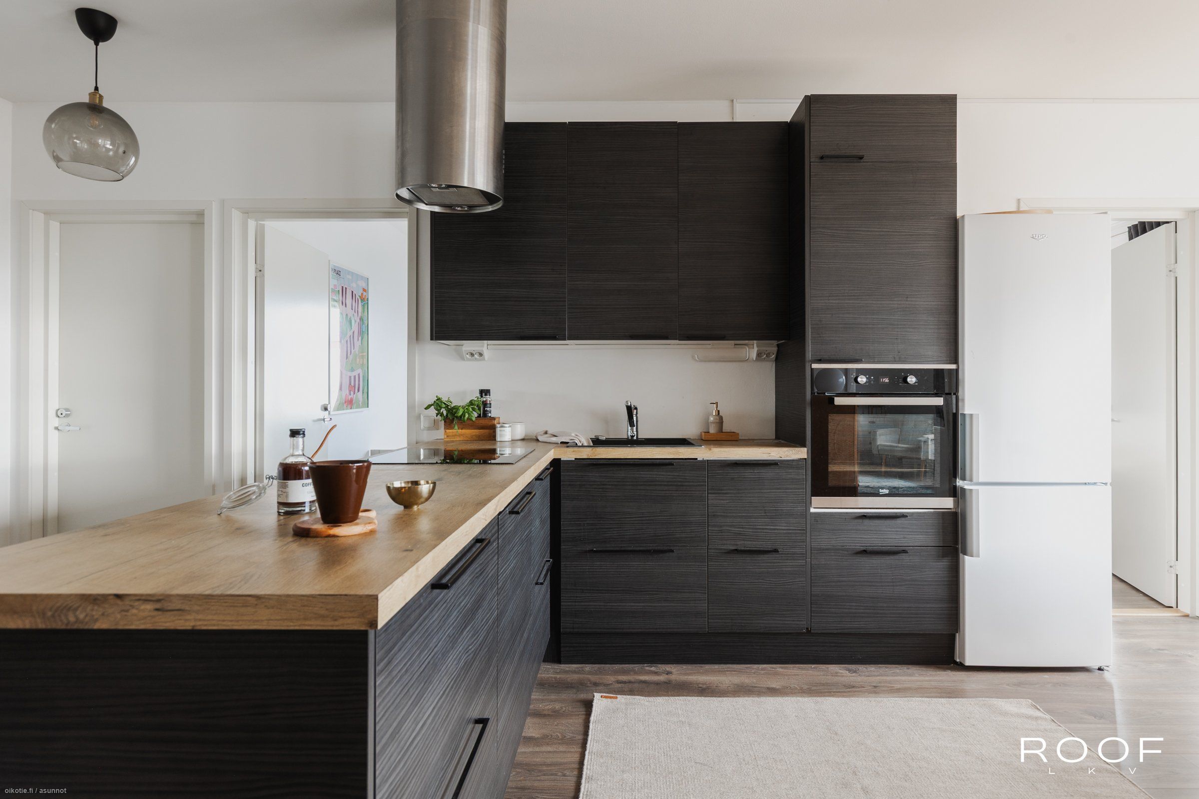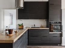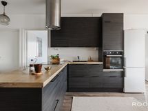 - Keittiön varusteet: Jääkaappipakastin, erillisuuni, astianpesukone, liesitaso ja liesituuletin. Liesi: Induktioliesi. Työtason materiaali: Laminaatti.
