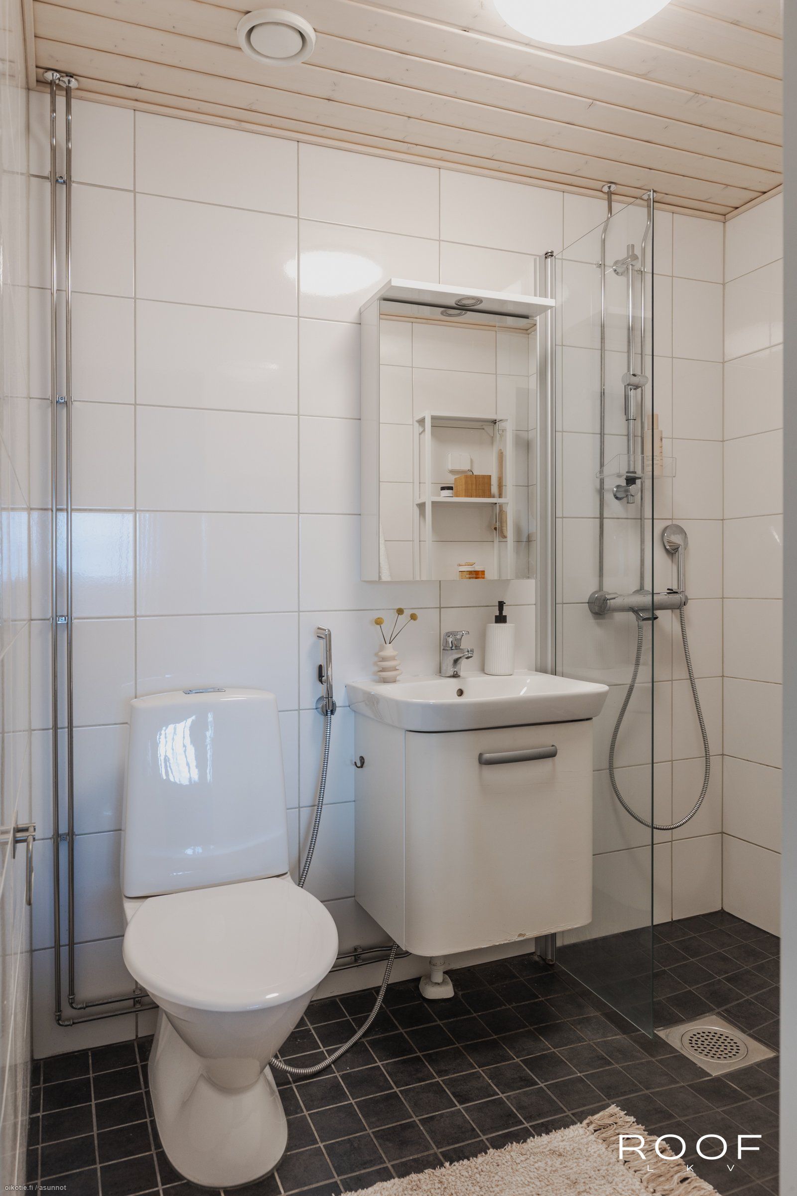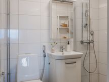 - Pesutilojen varusteet: WC-istuin, suihku, suihkuseinä, peilikaappi, lattialämmitys, allaskaappi, pesuallas ja bidee-suihku.