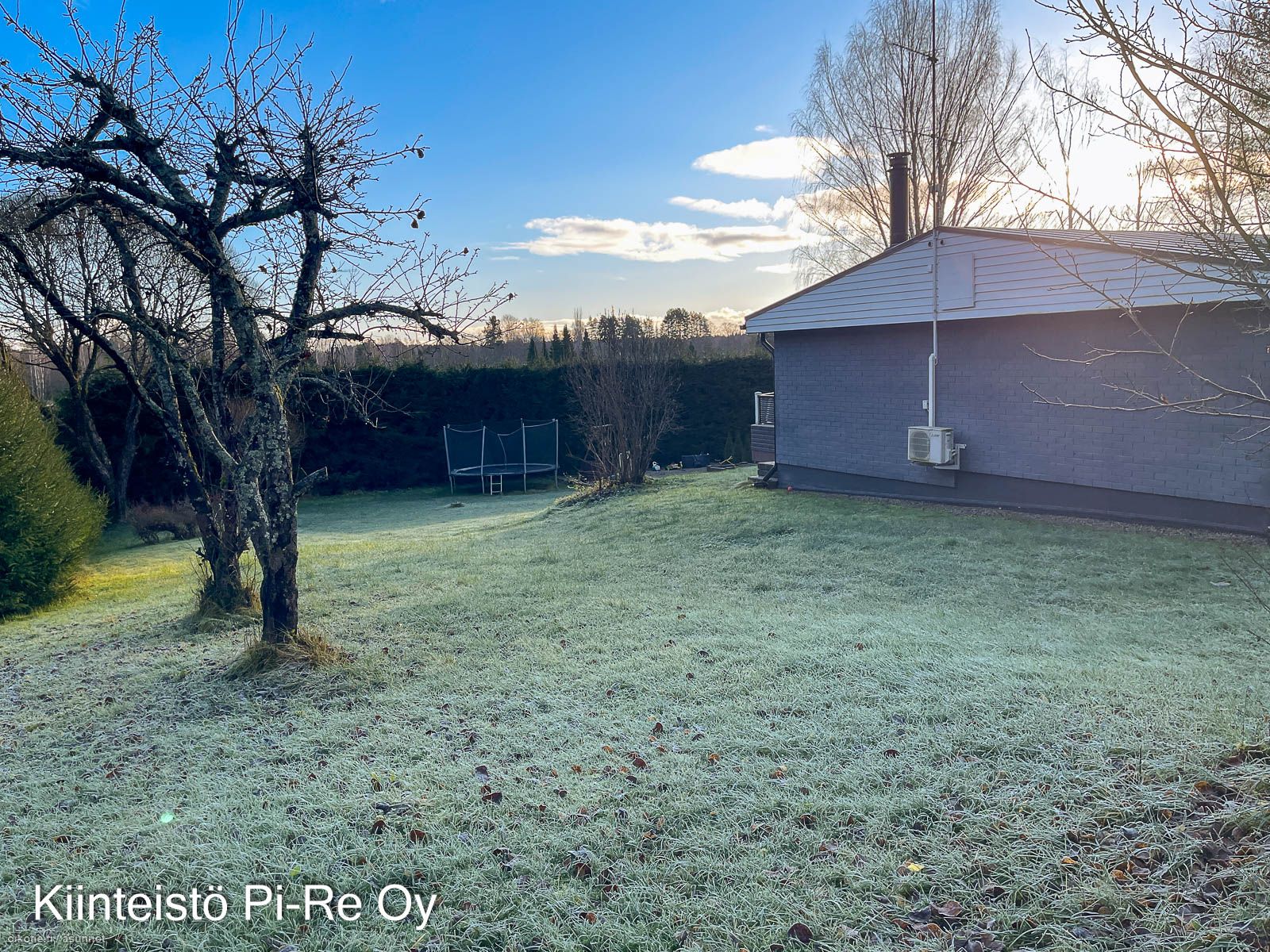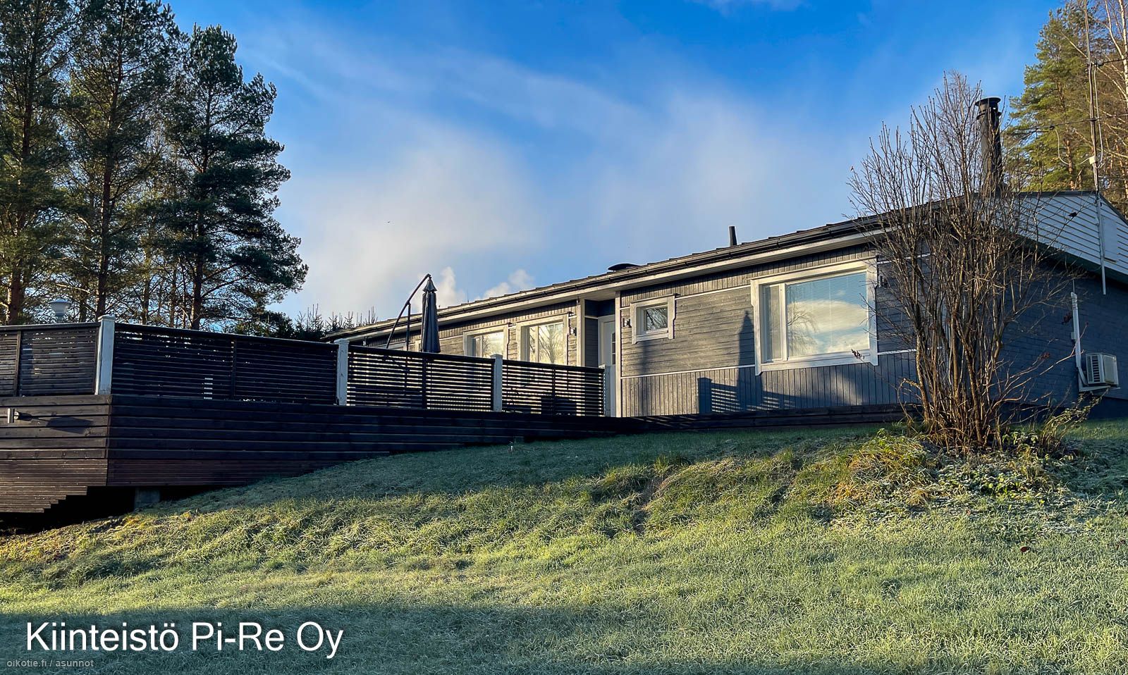 - Yhdessä tasossa oleva omakotitalo, jossa olohuone, keittiö, neljä makuuhuonetta, kodinhoitohuone, pesuhuone, sauna, wc, eteistilat, pannuhuone ja puuvarasto. Huoneistoala 150 m² / kokonaisala 160 m + terassi 80 m². Pihassa varasto ulkotyökaluille.