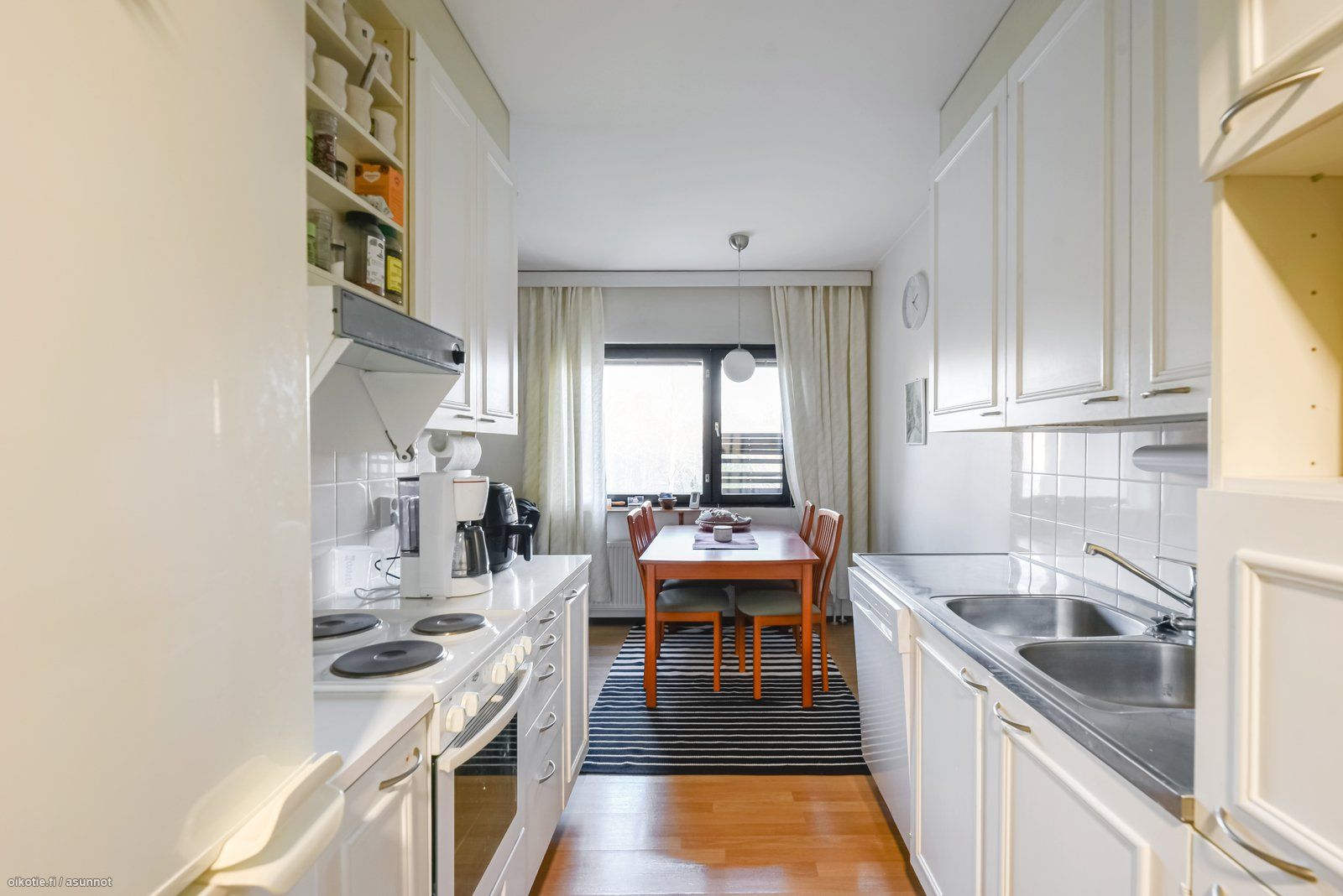 - Keittiön varusteet: Jääkaappipakastin, astianpesukone ja liesi. Liesi: Valurautaliesi. Työtason materiaali: Laminaatti.