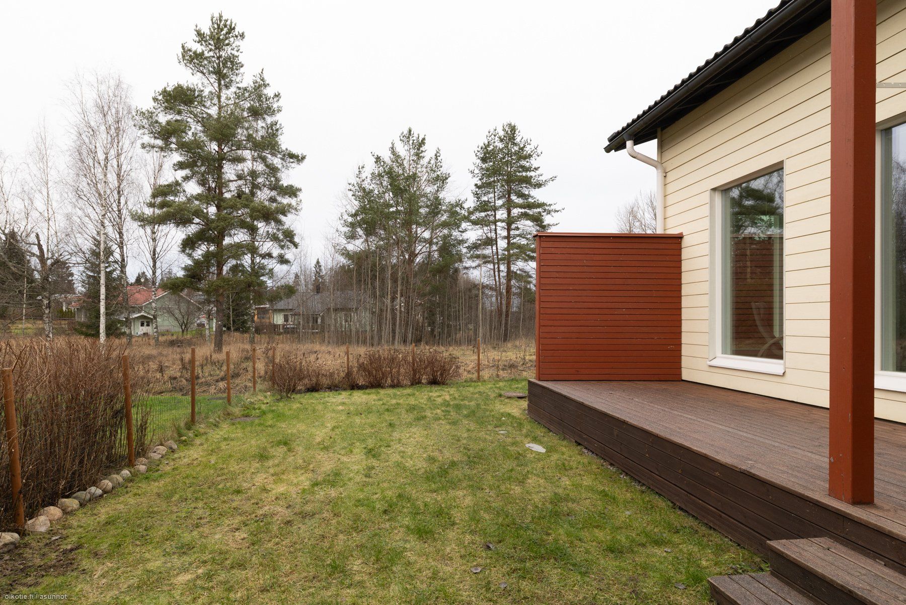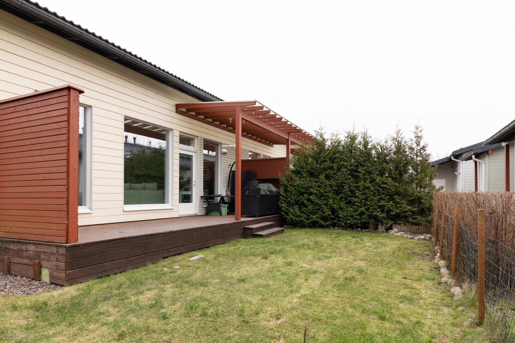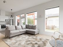 Olohuoneesta on käynti vehreälle ja poikkeuksellisen rauhalliselle takapihalle. Suuri terassi kutsuu nauttimaan kesäpäivistä, ja piha kiertää talon sivulle asti. Pihan vieressä sijaitseva virkistysalue lisää rauhaa ja yksityisyyttä - täällä saat olla omassa rauhassa!