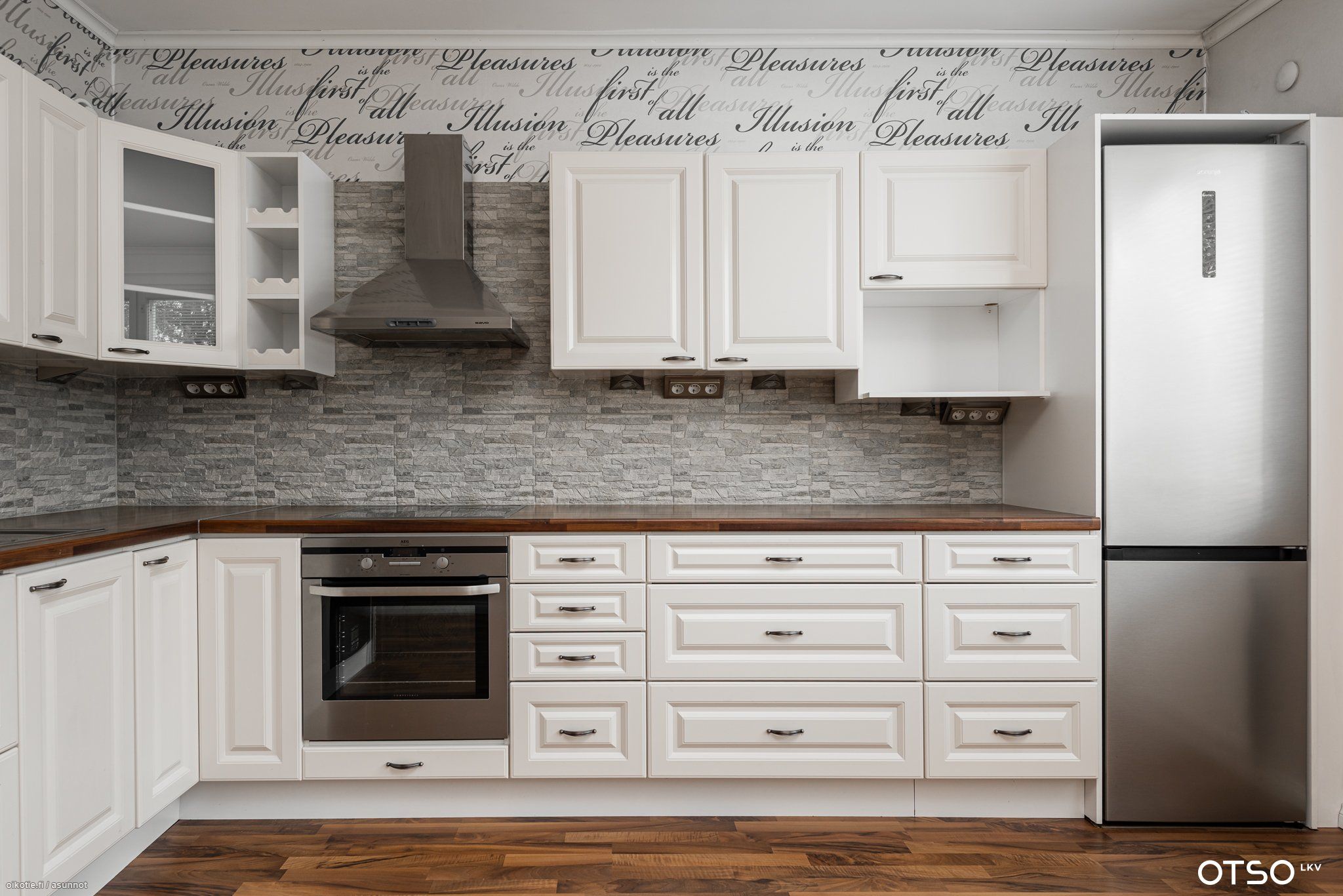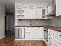 Kaunis keittiö on kyllä tämän kodin sydän ja keittiöön mahtuu isompikin ruokapöytä.