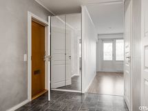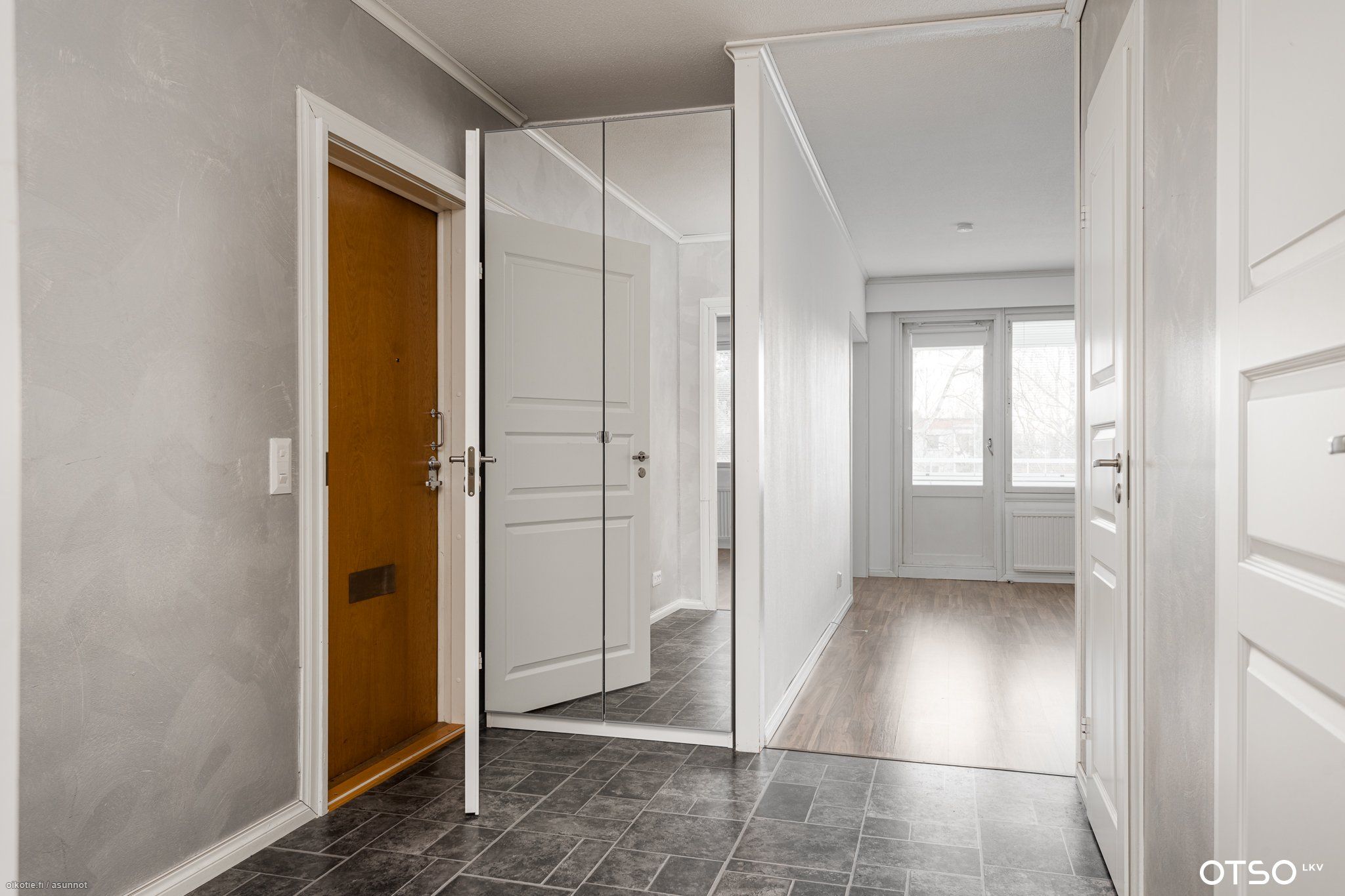 Ylimmän kerroksen hyväkuntoinen kolmio, jossa heti kivan säväyksen tuo tilava eteinen.