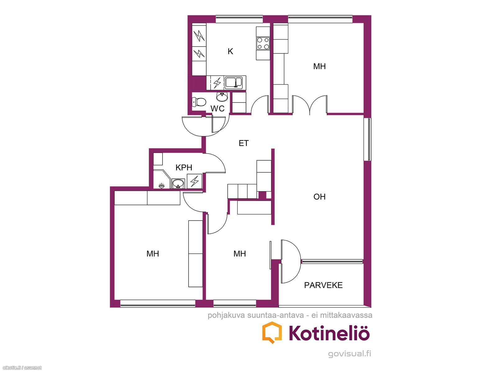 - Huoneiston pinnat tarvitsevat päivitystä, asunnossa ei ole tällä hetkellä jääkaappia eikä uunia. Erillisen wc:n laatat ovat osittain kopoja, korjaus jää ostajalle.