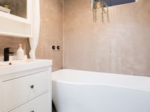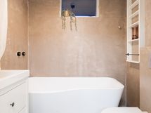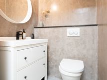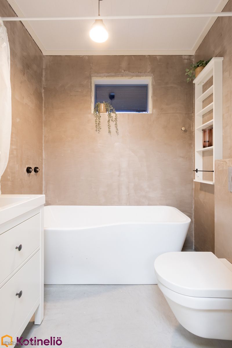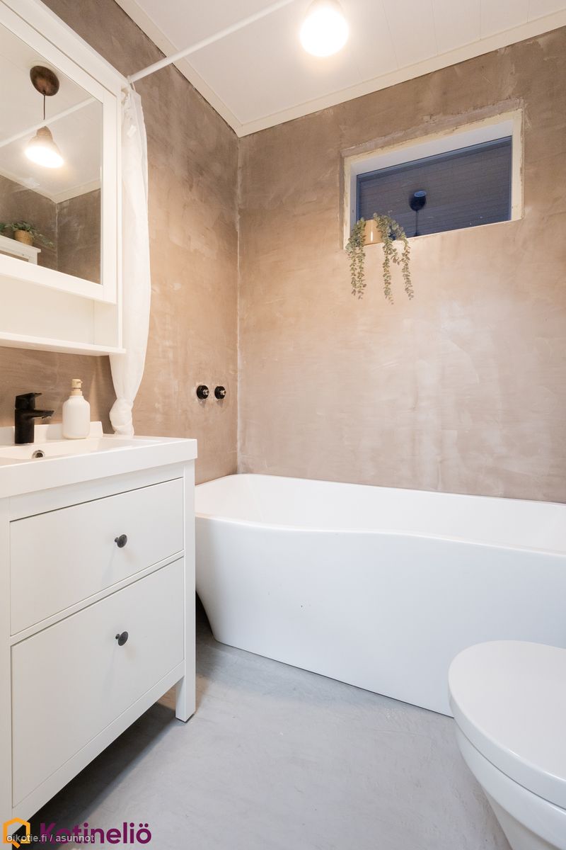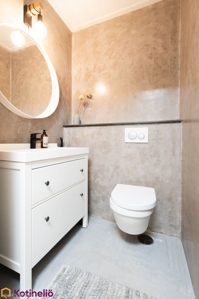 - Pesutilojen kuvaus: Saunan yhteydessä olevan kylpyhuoneen seinät ja lattia mikrosementtiä, katto paneelia. 2 suihkua. Toisessa kylpyhuoneessa on kylpyamme, wc-pönttö sekä käsienpesuallas. Varustus: kylpyamme, wc-istuin, peilikaappi, kiinteät valaisimet, kylpyhuonekaapisto. Erillisen WC:n kuvaus: Lattiat ja seinät mikrosementtiä. Wc-kaapisto ja peili. . Varustus: lattiakaivo, bidee-suihku.