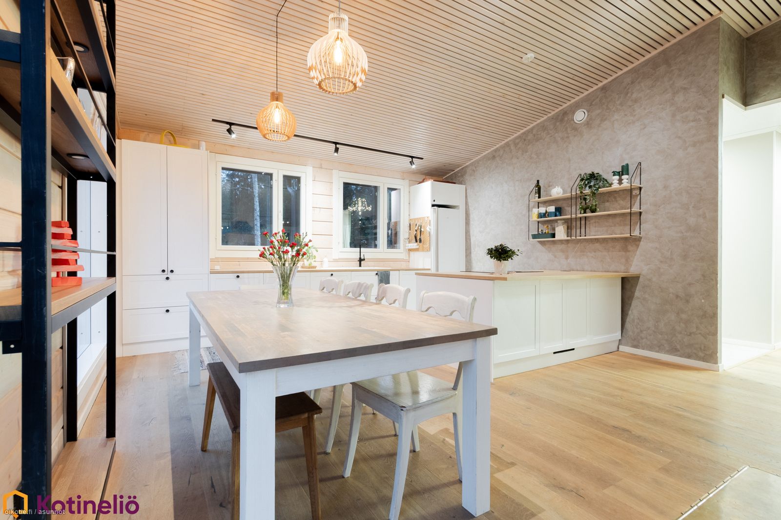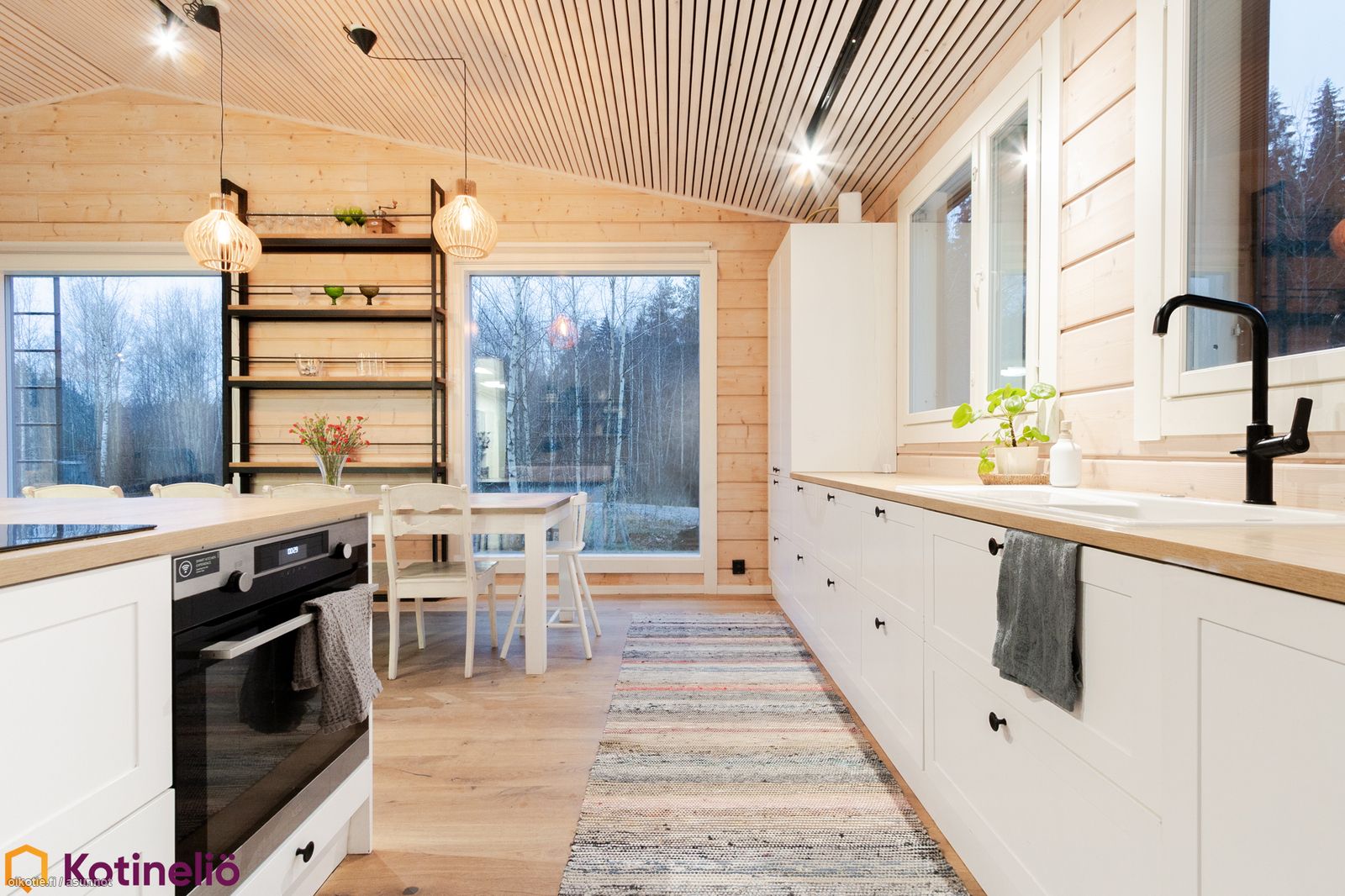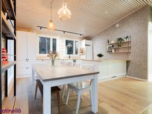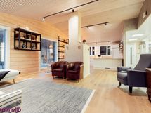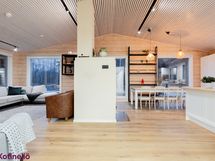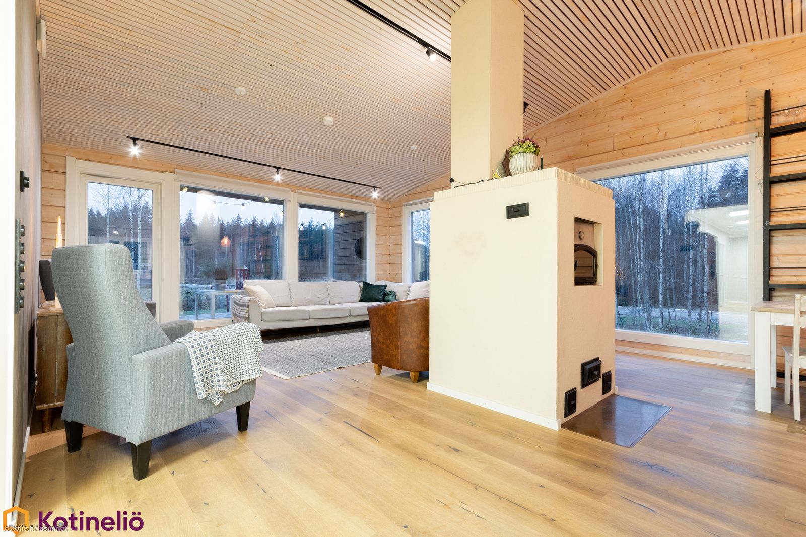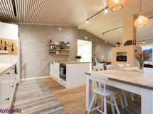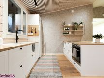 - Olohuone ja keittiö ovat yhtenäinen, korkea tila, jonka jakaa varaava leivinuuni.