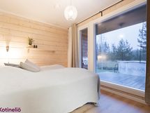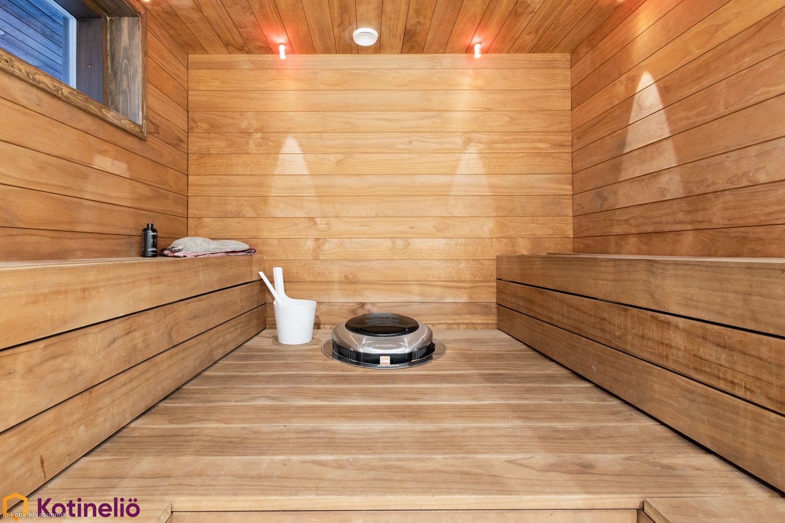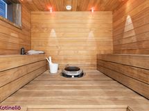 - Kuvaus: Sauna sijaitsee isomman kylpyhuoneen yhteydessä, lasiseinä lasiovella. Lauteet, seinät ja katto puuta. Lattia mikrosementtiä. heti valmis -sähkökiuas