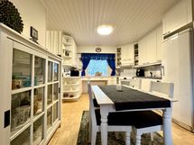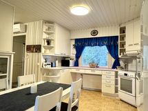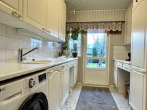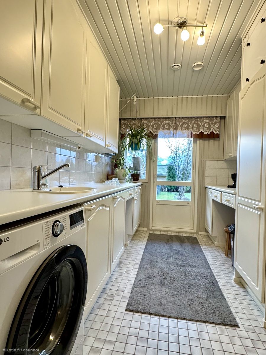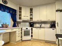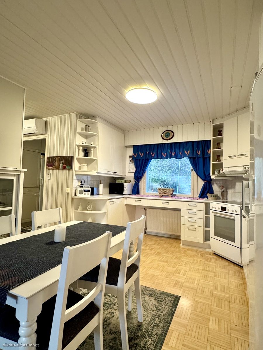 - Siisti vaalea keittiö avautuu olohuoneeseen. Avara keittiö, jossa hyvin kaapistoa ja tilaa isommallekin ruokailuryhmälle. Keittiön kaapistojen ovet ja koneita uusittu. Lattia parkettia, seinät tapettia. Varusteena jääkaappi/pakastin, keraaminen liesi, astianpesukone, liesituuletin (hormiin).