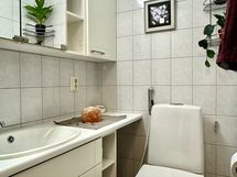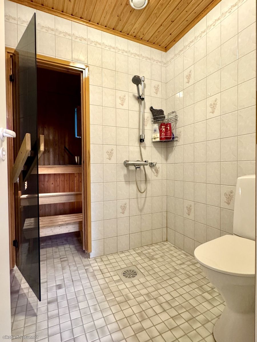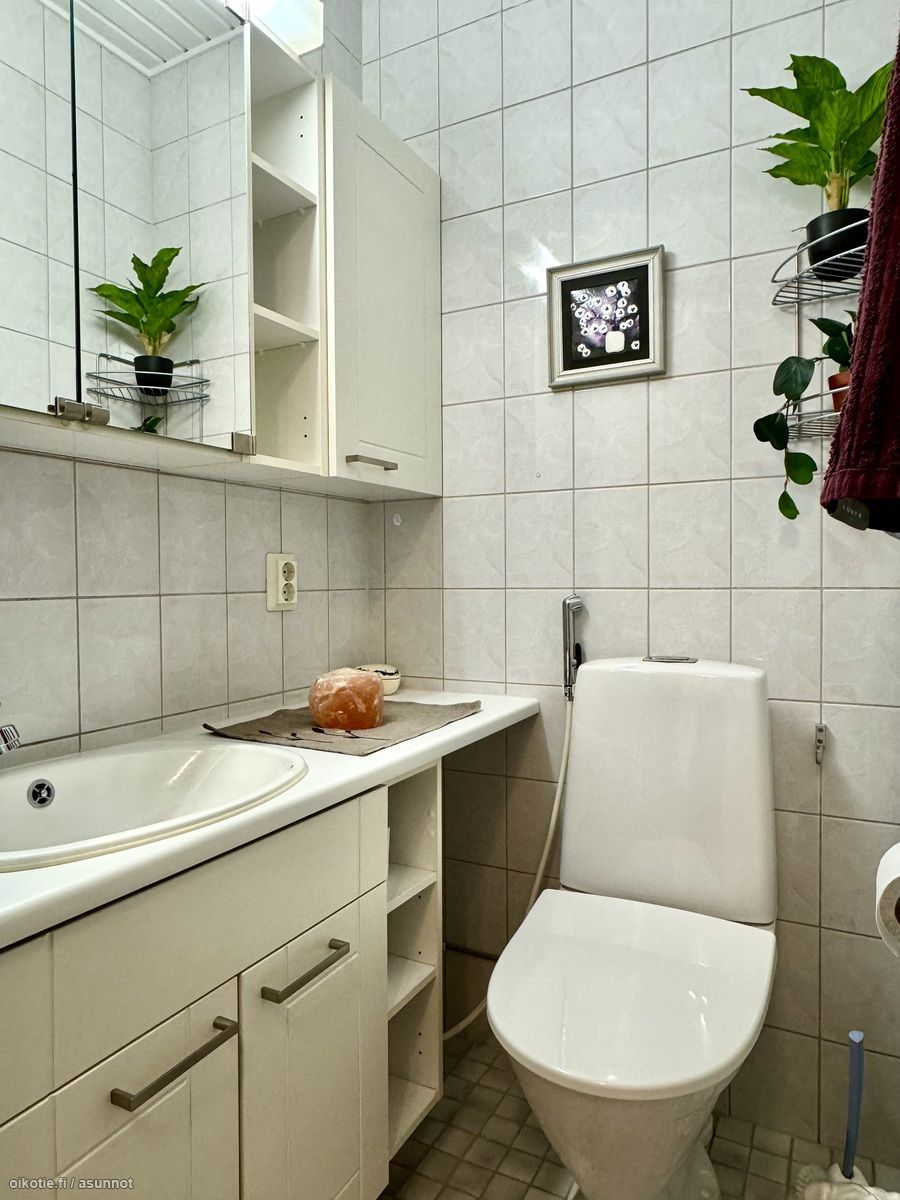 - Pesutilojen kuvaus: Laatoitettu kylpyhuone. Varusteena suihku (uusi), vesikiertoinen lattialämmitys (kaukolämpö). Kylpyhuoneesta käynti kodinhoitotilan kautta suoraan ulos takapihan patiolle. . Erillisen WC:n kuvaus: Erillinen wc, jossa varusteena allas- ja peilikaapistoa. Kaapistojen ovet uusittu. Lattia ja seinät laatoitettu, lattialämmitys. Toiset WC-toiminnot kph:ssa.
