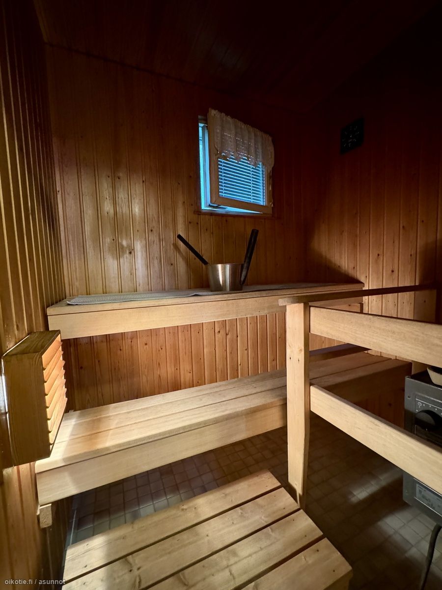 - Kuvaus: Ikkunallinen sauna, jossa varusteena sähkökiuas. Lattia laatoitettu, seinät paneelia. .