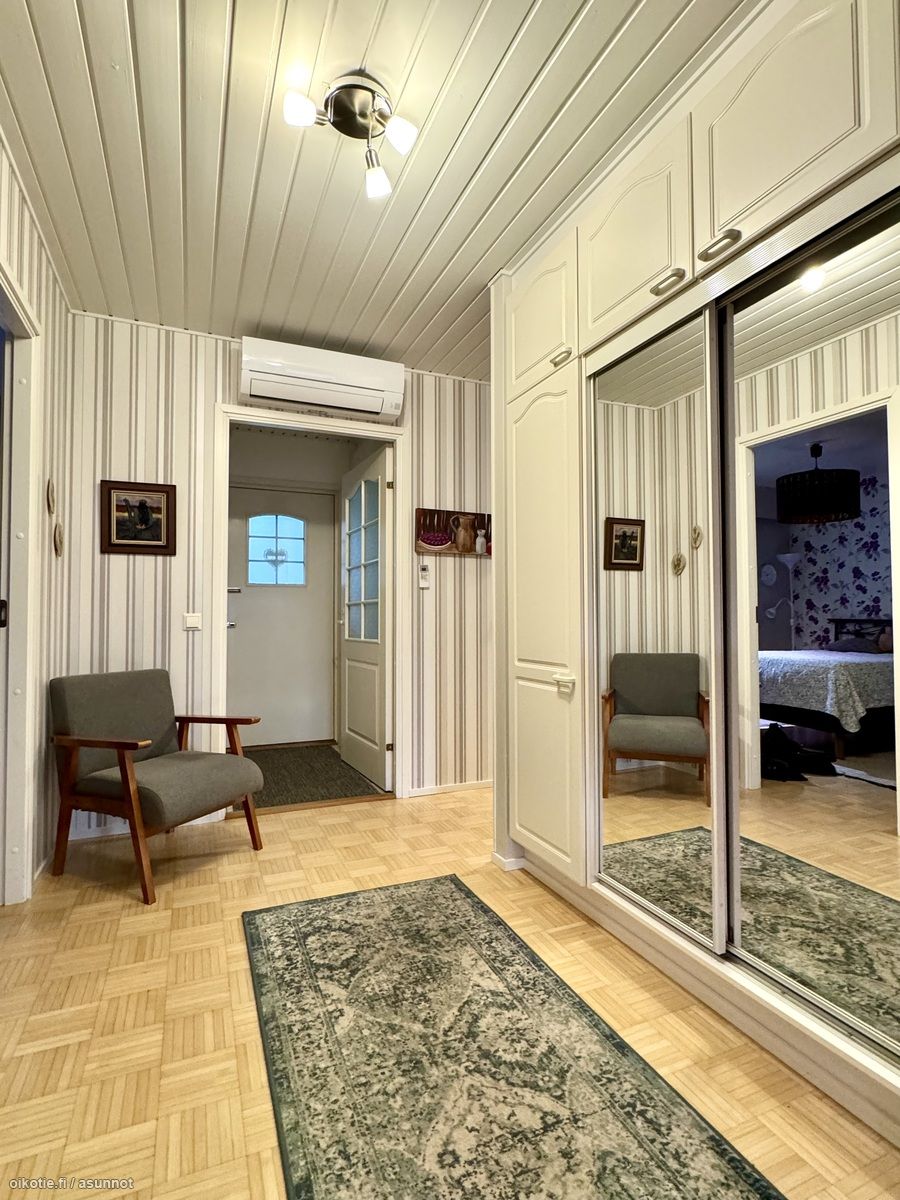 - Hyvänkokoinen eteistila ja tuulikaappi. Varusteena kaapistoa. Tuulikaapissa laatoitettu lattia, lattialämmitys.