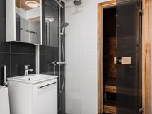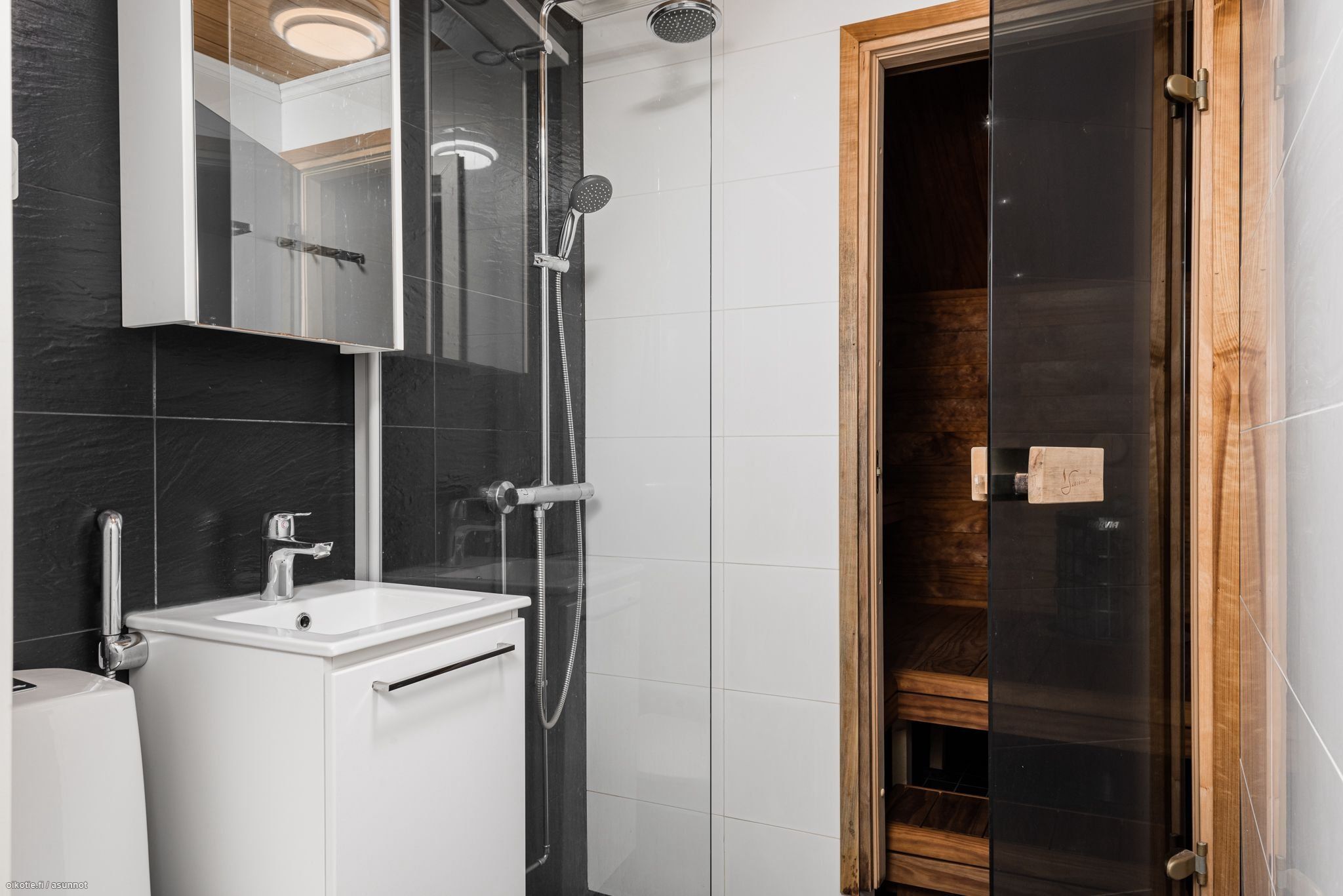 Asunnon sauna tarjoaa rentouttavat löylyt, ja kylpyhuoneessa on mukavuuksia kuten lattialämmitys ja pesukoneliitäntä. Lisäksi erillinen wc tuo arkeen käytännöllisyyttä.