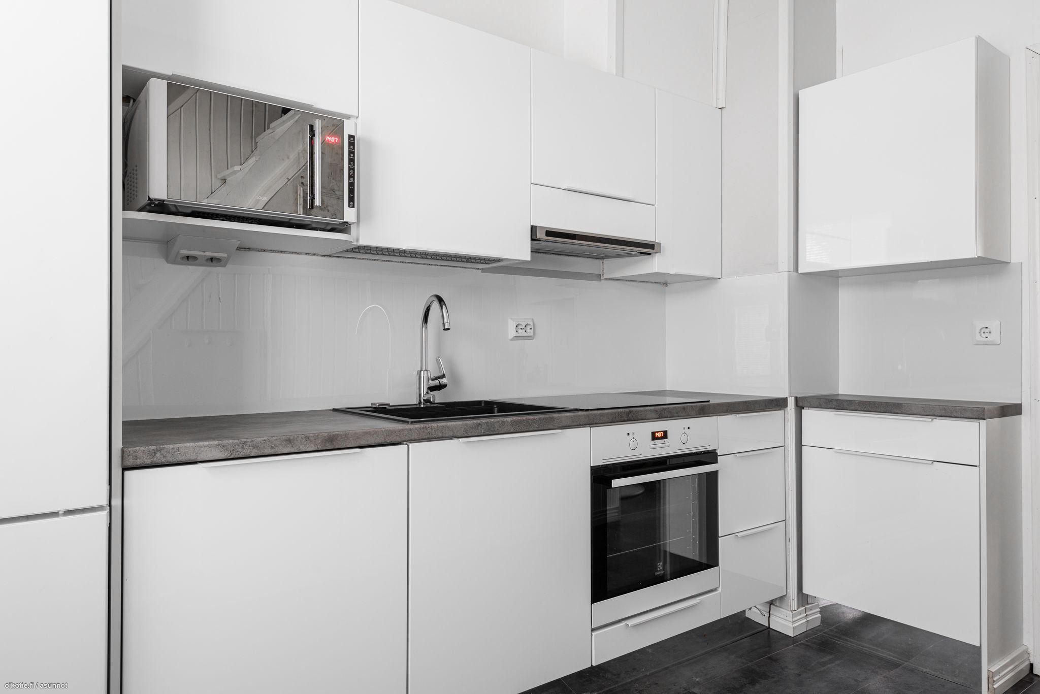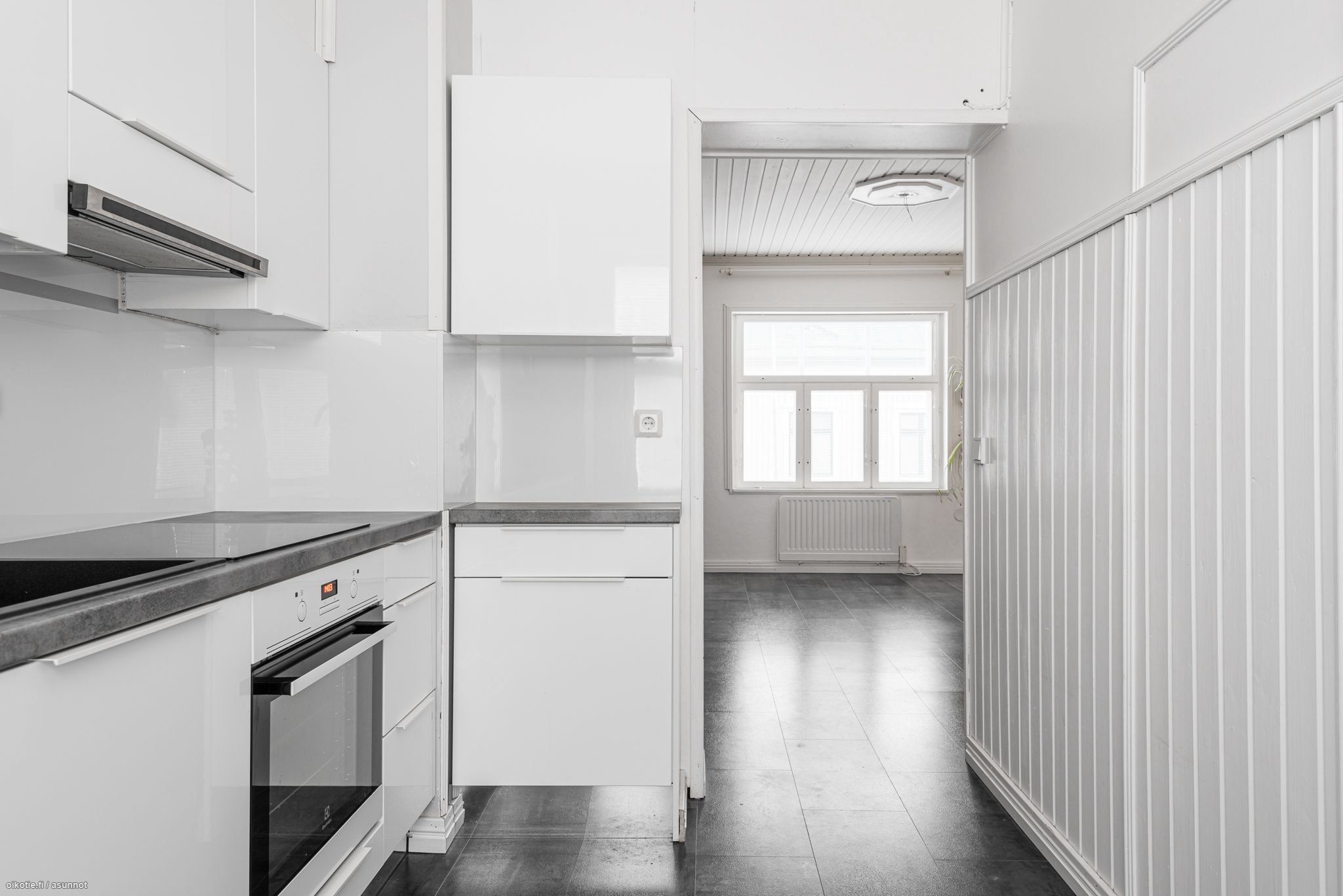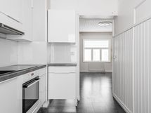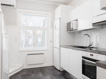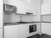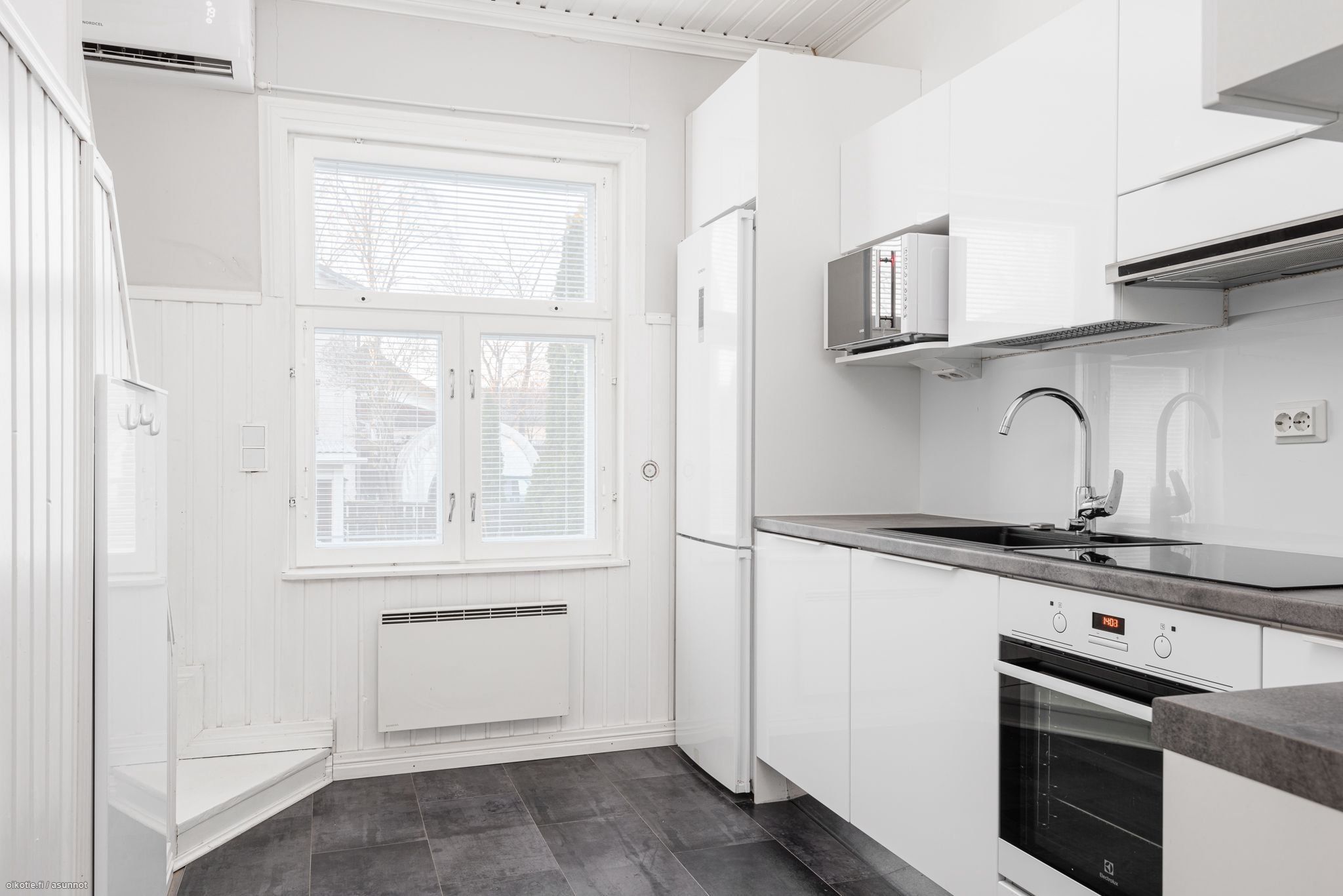 - Keittiön varusteet: Jääkaappipakastin, astianpesukone, uuni, liesituuletin ja mikroaaltouuni. Liesi: Induktioliesi. Työtason materiaali: Laminaatti.
