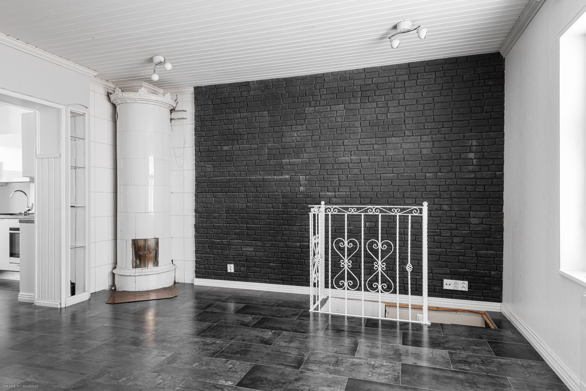 - Olohuoneessa kaunis tiilikuvioinen tehosteseinä ja toimintakuntoinen takka.