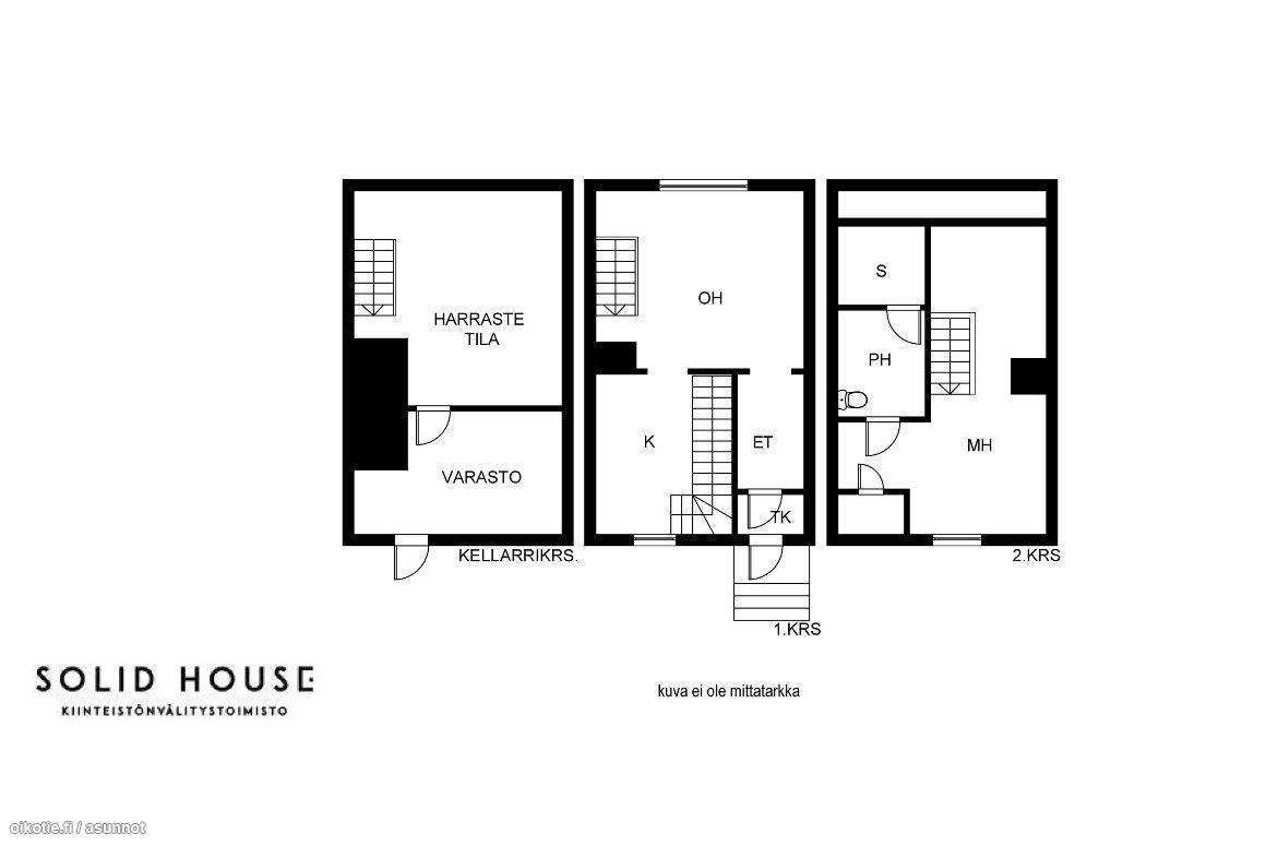 - Pinta-alan peruste: Ei tarkistusmitattu. Pinta-alat saattavat tämän ikäisissä kohteissa (rekisteröity ennen 01.01.1992) poiketa olennaisestikin asuinrakennusten nykyisten mittaustapojen ja standardien (SFS 5139) mukaan laskettavasta asuintilojen pinta-alasta. Pinta-ala voi siis olla edellä mainittua pienempi tai suurempi. Kellarikerrokseen remontoitu 2005 harrastetilaa n.20m2 edestä. Pinta-ala ei ole tarkistusmitattu ja todellinen pinta-ala voi olla suurempi tai pienempi, kuin ilmoitettu.