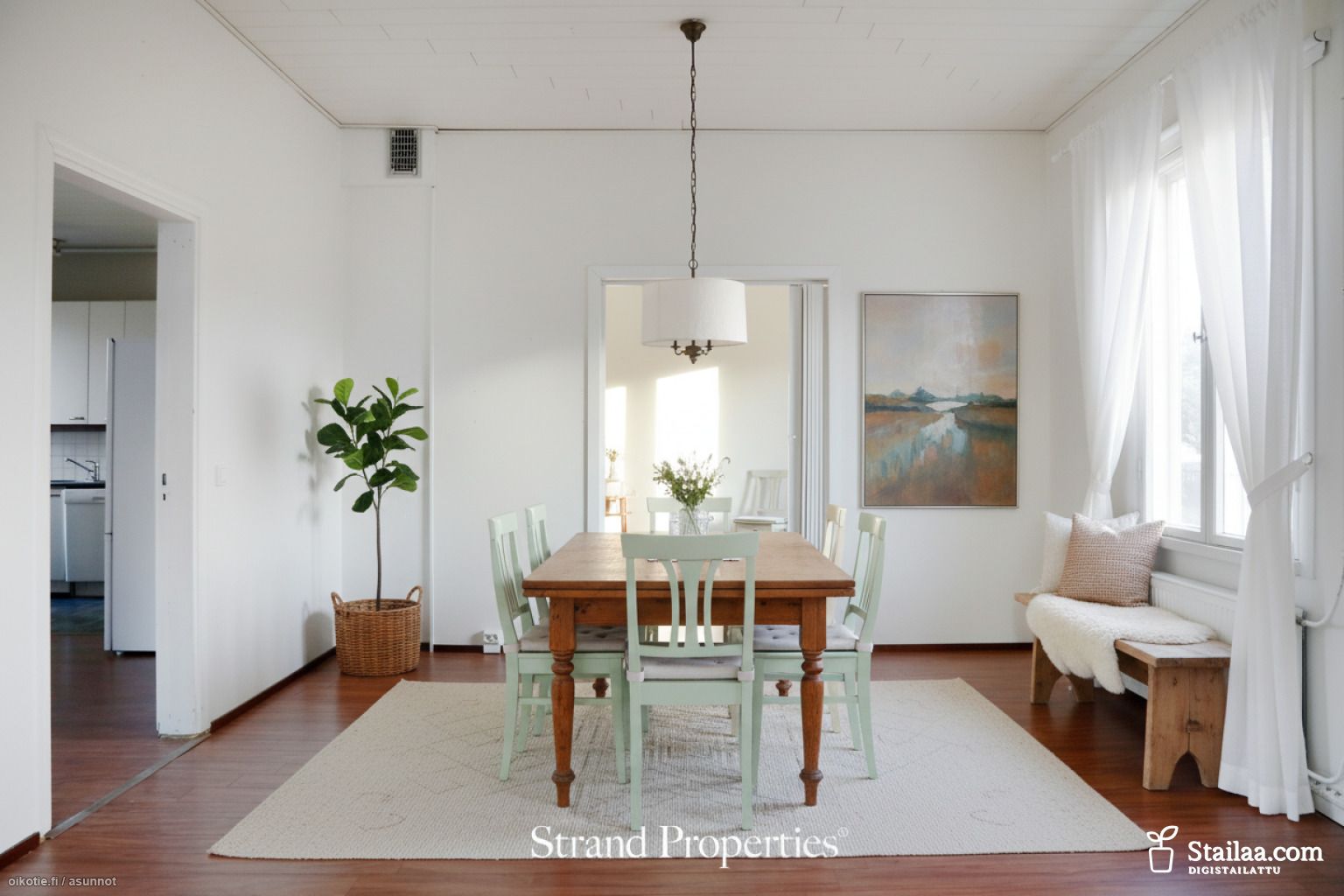 - Lattia: Keittiössä: laminaatti. Pesutiloissa: laatta. Olohuoneessa: laminaatti. Makuuhuoneessa: laminaatti. Seinät: Keittiössä: tapetti, osalaatoitus. Pesutiloissa: kaakeli. Olohuoneessa: maalattu, tapetti. Makuuhuoneessa: maalattu, tapetti.