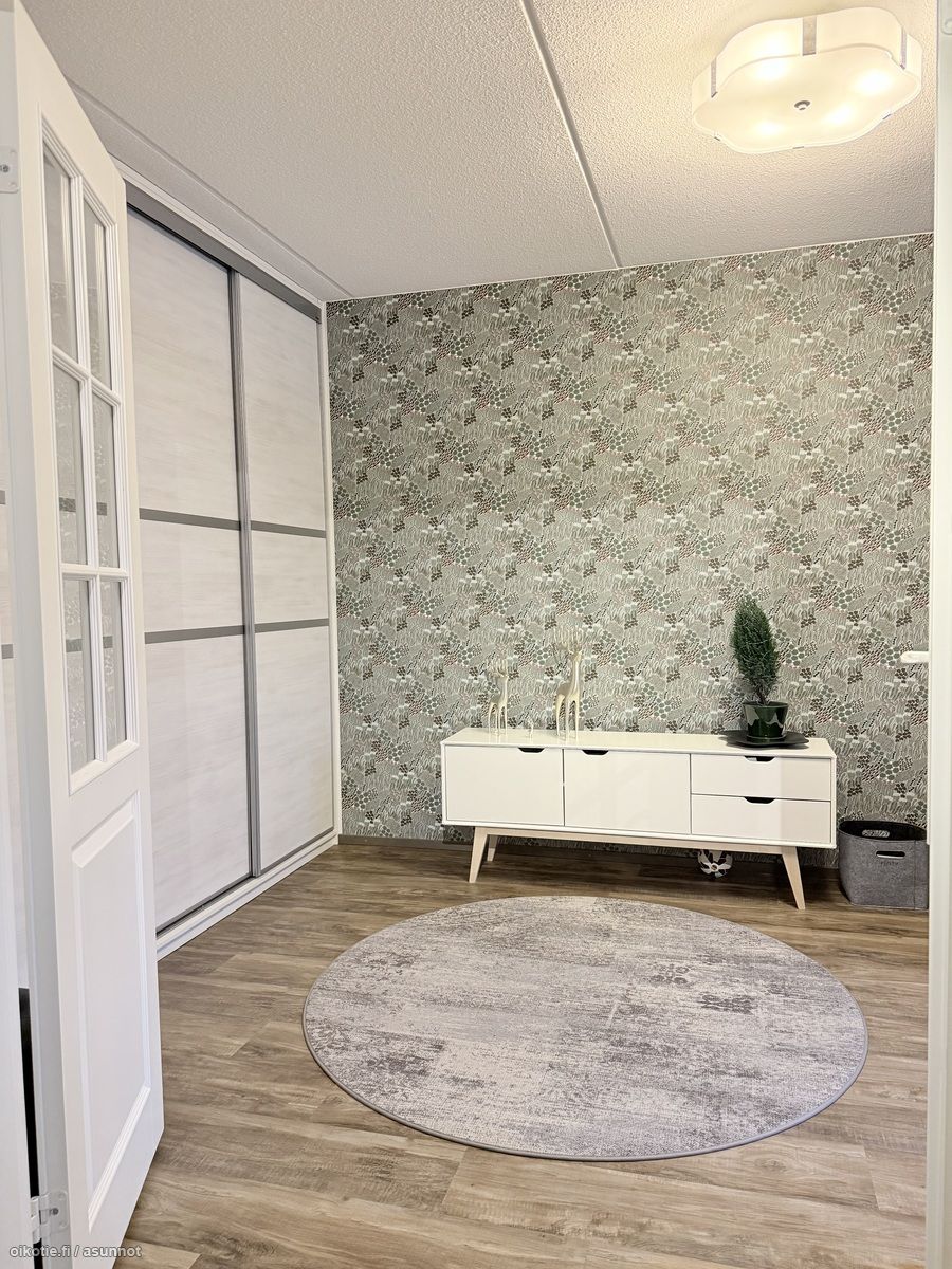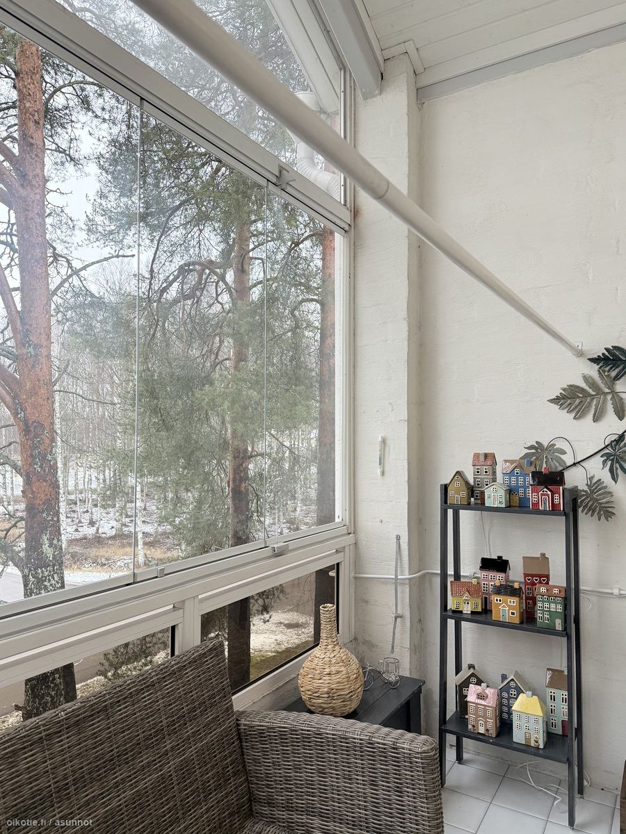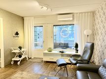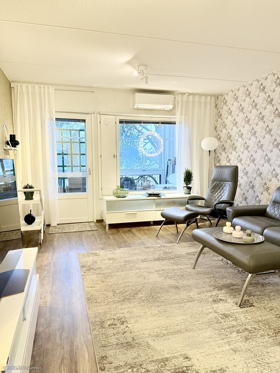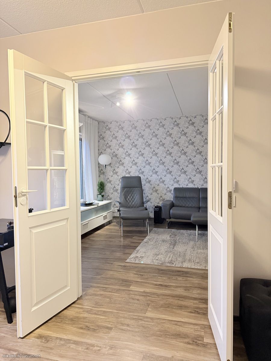 - Kaikki olohuoneen seinät tapetoitu. Vinyylikorkkilattia. Käynti ulos suurelle, lasitetulle parvekkeelle. Ilmalämpöpumppu (viilentävä).