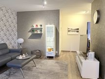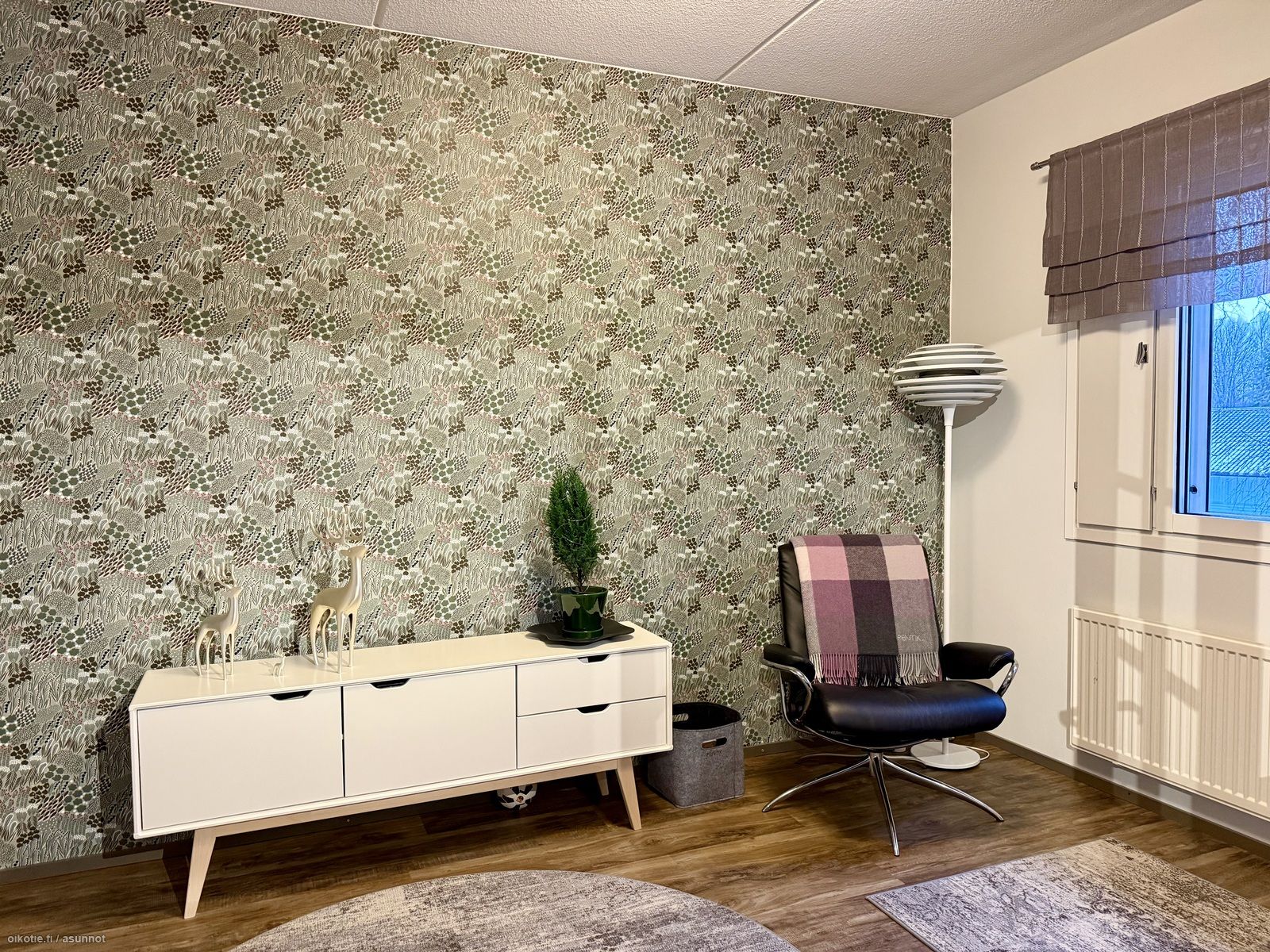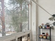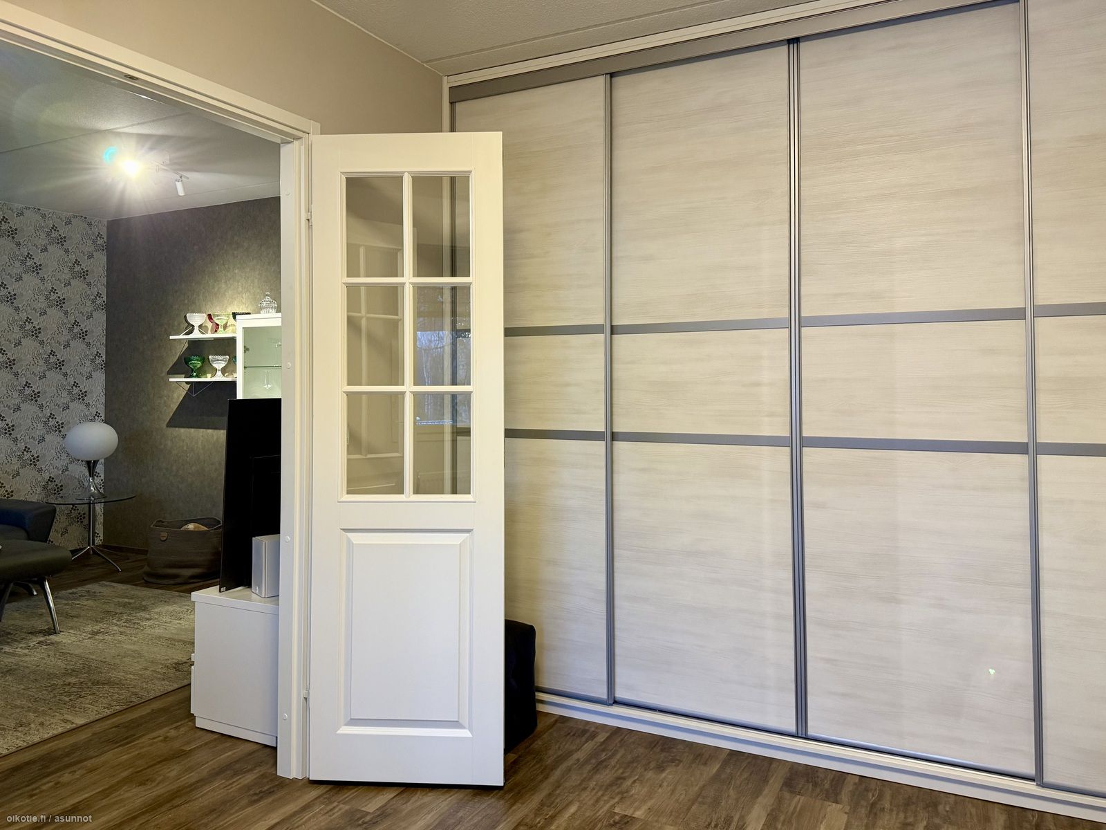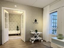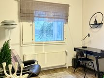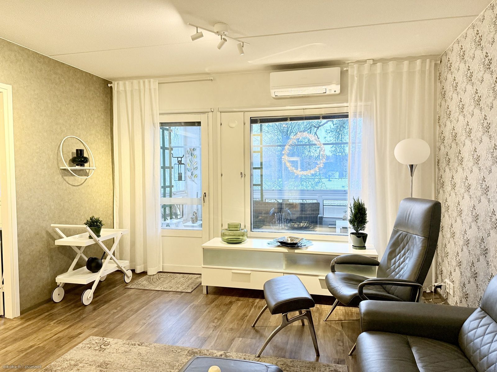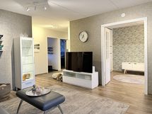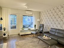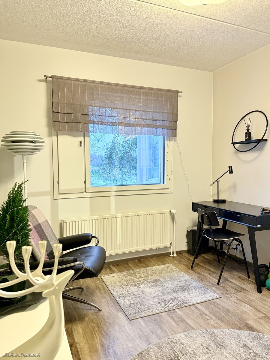 - Kaikki olohuoneen seinät tapetoitu. Vinyylikorkkilattia. Käynti ulos suurelle, lasitetulle parvekkeelle. Ilmalämpöpumppu (viilentävä).