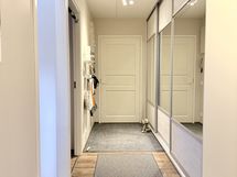 - Eteisessä maalatut seinäpinnat. Lattia osin laatoitettu (ulko-oven edusta), osin vinyylilankkulattia. Hyvät säilytystilat (liukuovikaapistot, pakastin sijoitettu ko. kaapistoon).