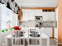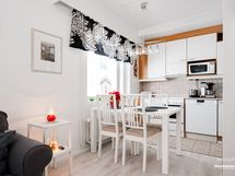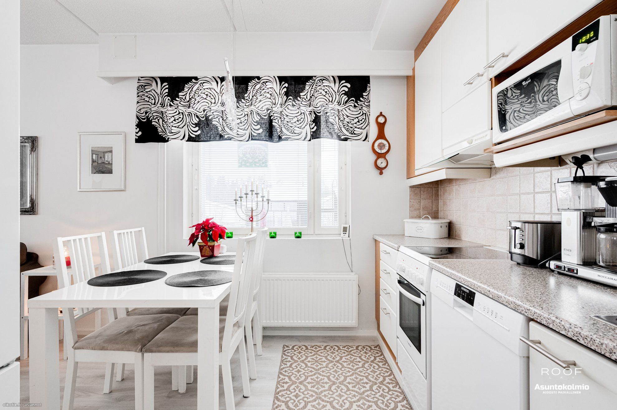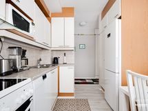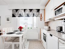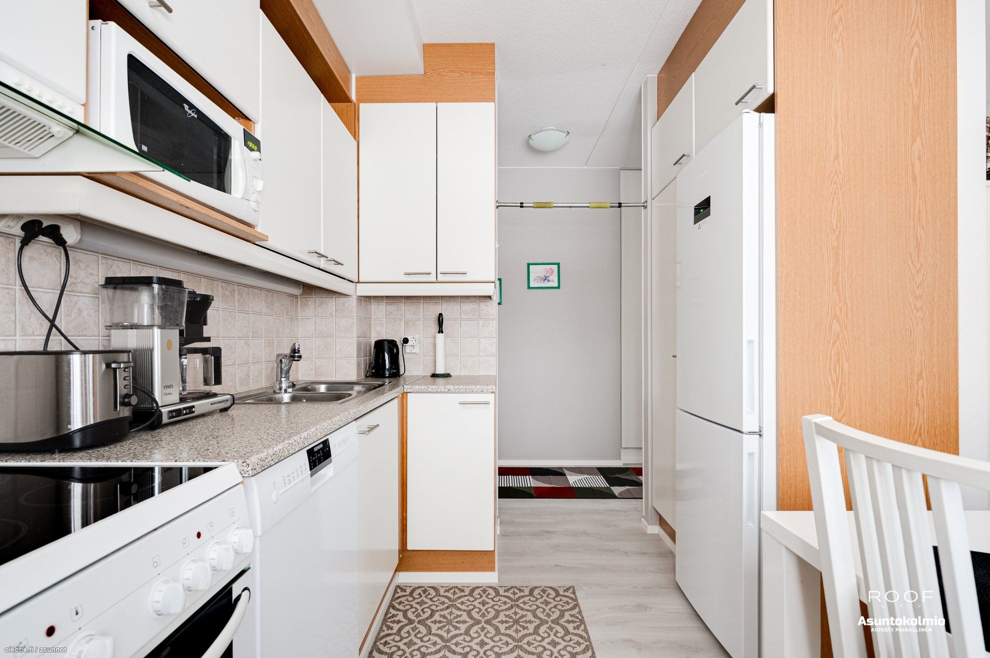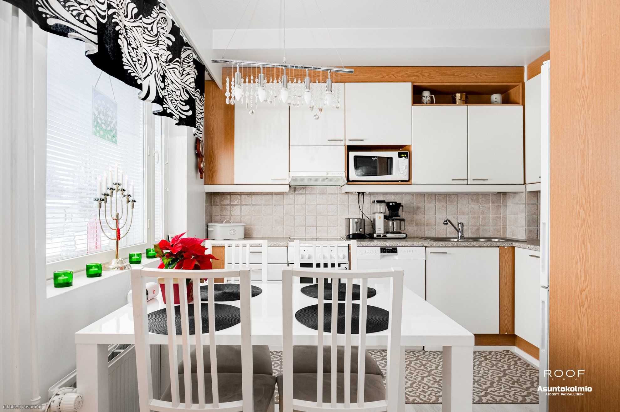 - Keittiön varusteet: Jääkaappipakastin, astianpesukone, liesi ja liesituuletin. Liesi: Keraaminen liesi. Työtason materiaali: Laminaatti.