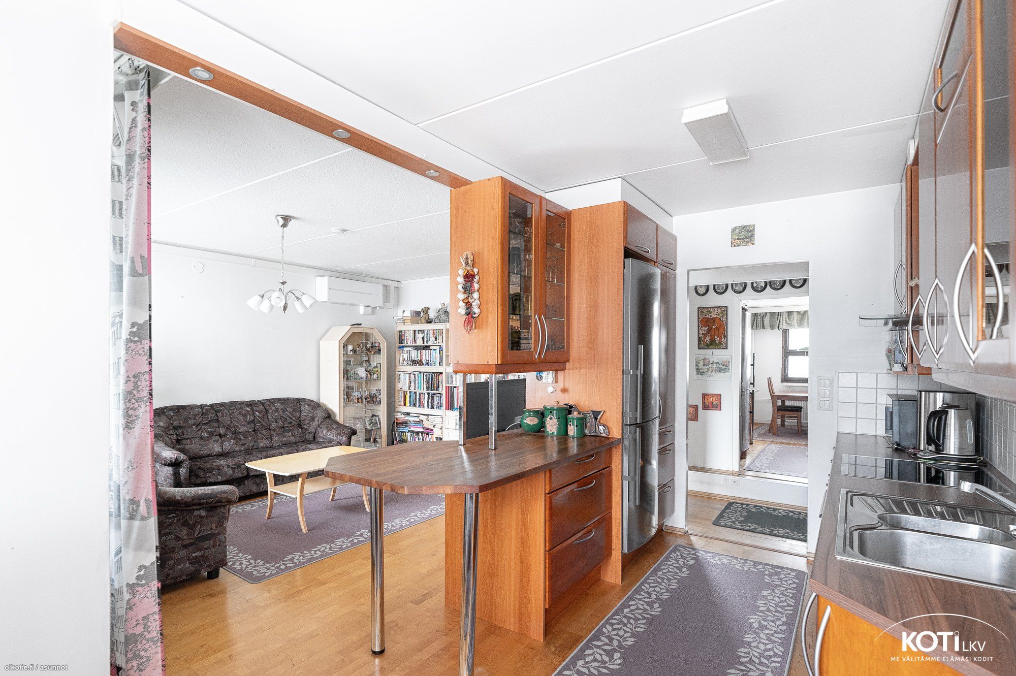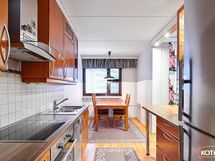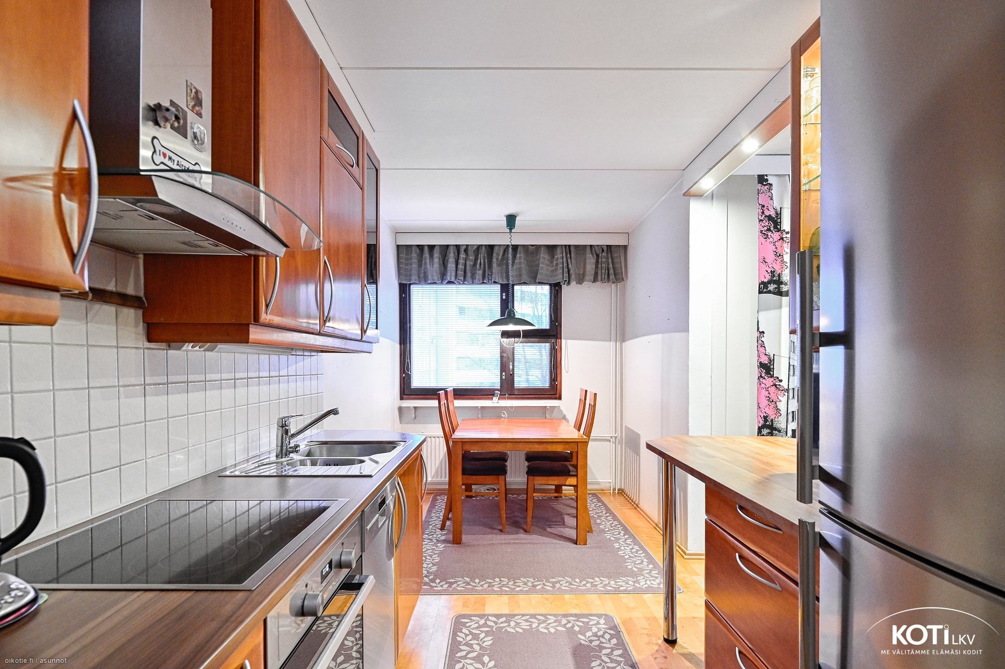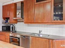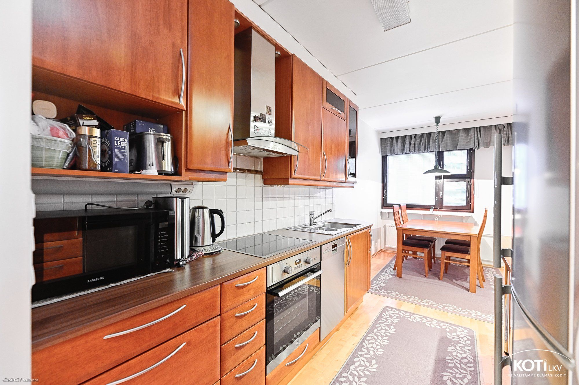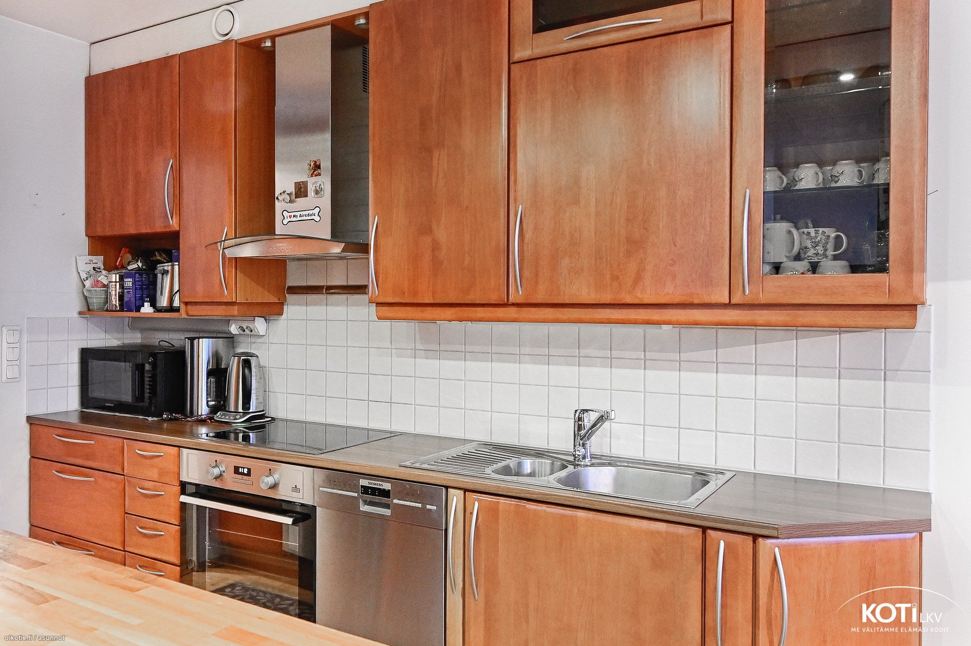 - Keittiön varusteet: Jääkaappipakastin, erillisuuni, liesituuletin, mikroaaltouuni, astianpesukone ja keittiösaareke (Täyspuinen keittiösaareke). Liesi: Induktioliesi. Työtason materiaali: Laminaatti. Avokeittiö, reilusti kaappeja ja laskutilaa. Keittiön yhteydessä ruokailutila, näkymät sisäpihalle.