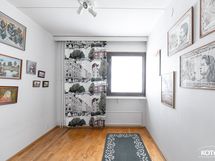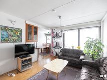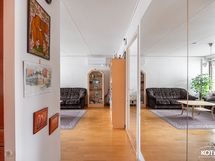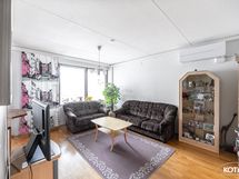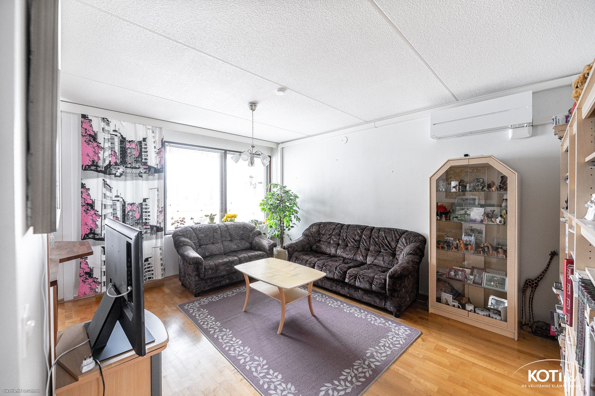 - Olohuoneesta käynti tilavalle lasitetulle parvekkeelle. Olohuoneessa ilmalämpöpumppu viilennykseen.