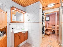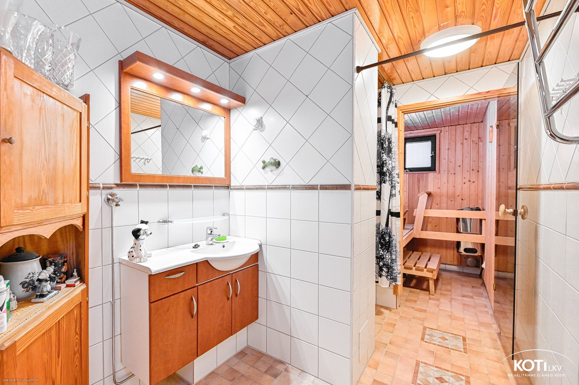 - Pesutilojen varusteet: WC-istuin, suihku, peilikaappi, pesukoneliitäntä, pesuallas, allaskaappi ja rättipatteri. Pesutilojen kuvaus: Siistikuntoinen kylpyhuone, jossa tila pesutornille ja pesukoneliityntä valmiina. Erillisten WC:n lukumäärä: 1. Erillisen WC:n varusteet: Peili, pesuallas, allaskaappi, bidee-suihku ja wc-istuin.