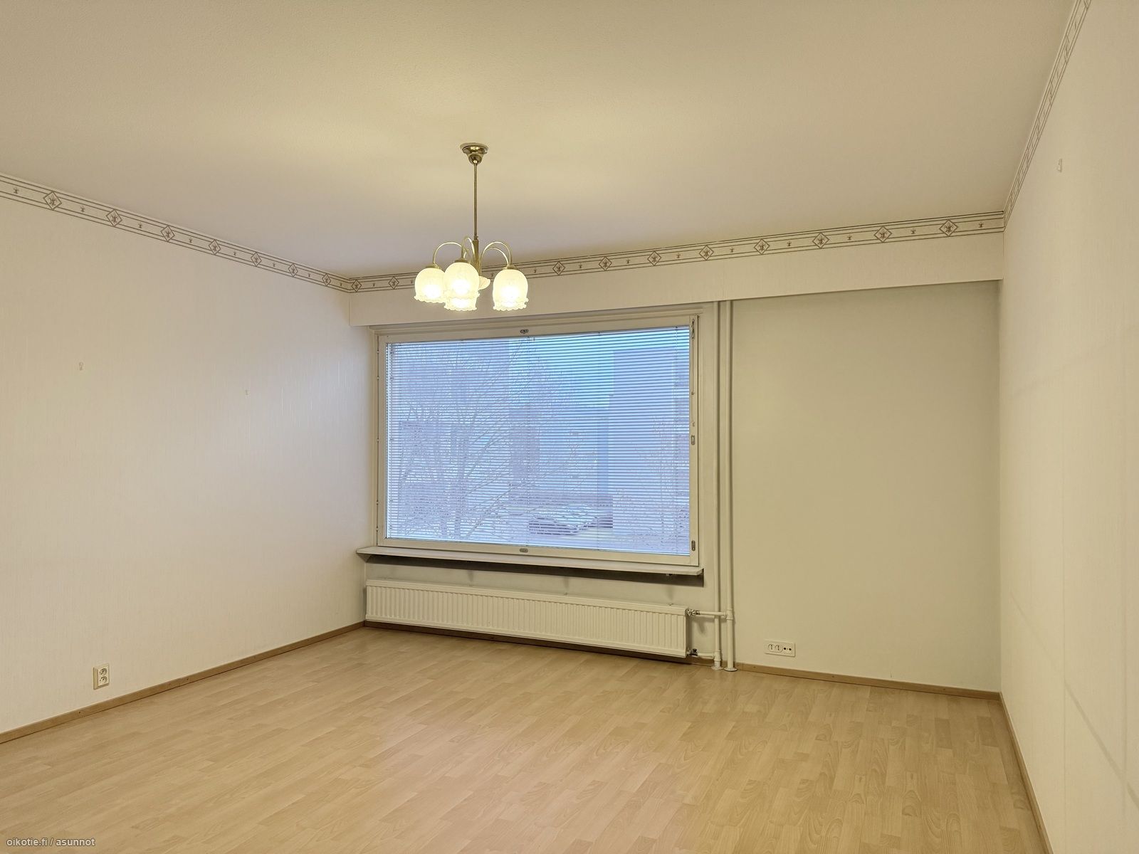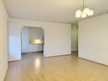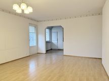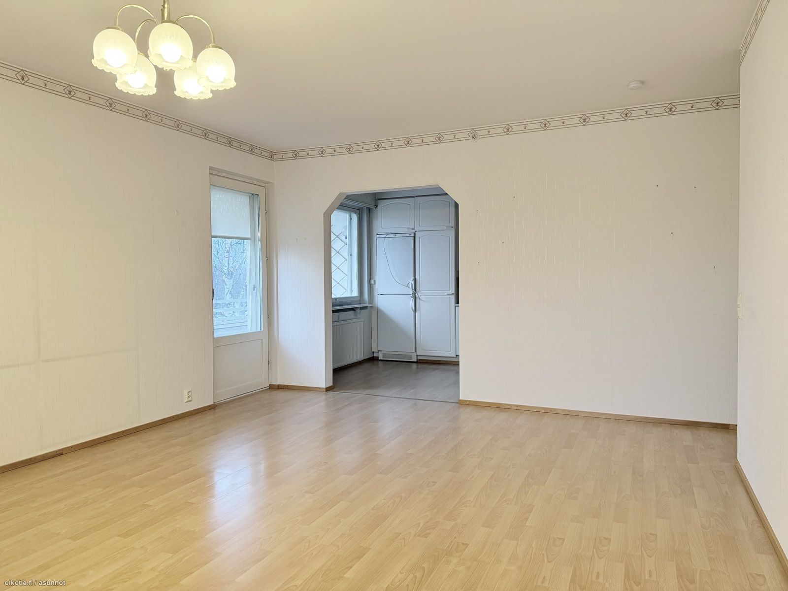 - Valoisa olohuone, jossa tapetoidut seinät ja laminaattilattia. Käynti huoneiston lasitetulle parvekkeelle.