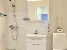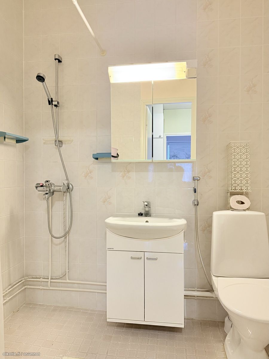 - Pesutilojen kuvaus: Kylpyhuoneen seinät on kaakeloitu ja lattia laatoitettu. Allaskaapisto ja altaan yllä peilikaappi. Lisäksi pyykki-/kylpyhuonekaapisto. Pesukoneelle ei ole kiinteää liittymää. Wc-toiminnot samassa tilassa.