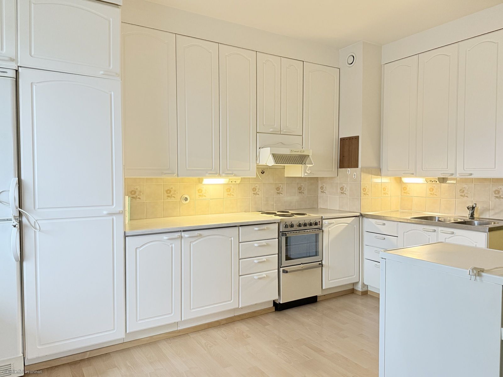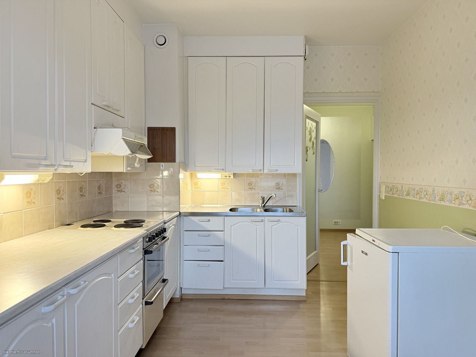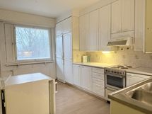- Tapetoidut seinät ja laminaattilattia. Kaapistojen ovet ja laatikostot uusittu, kaapistojen rungot ovat alkuperäisiä. Varusteina; sähköliesi, liesituuletin ja jää-/viileäkaappi. Lisäksi erillinen, pieni pystypakastin.
