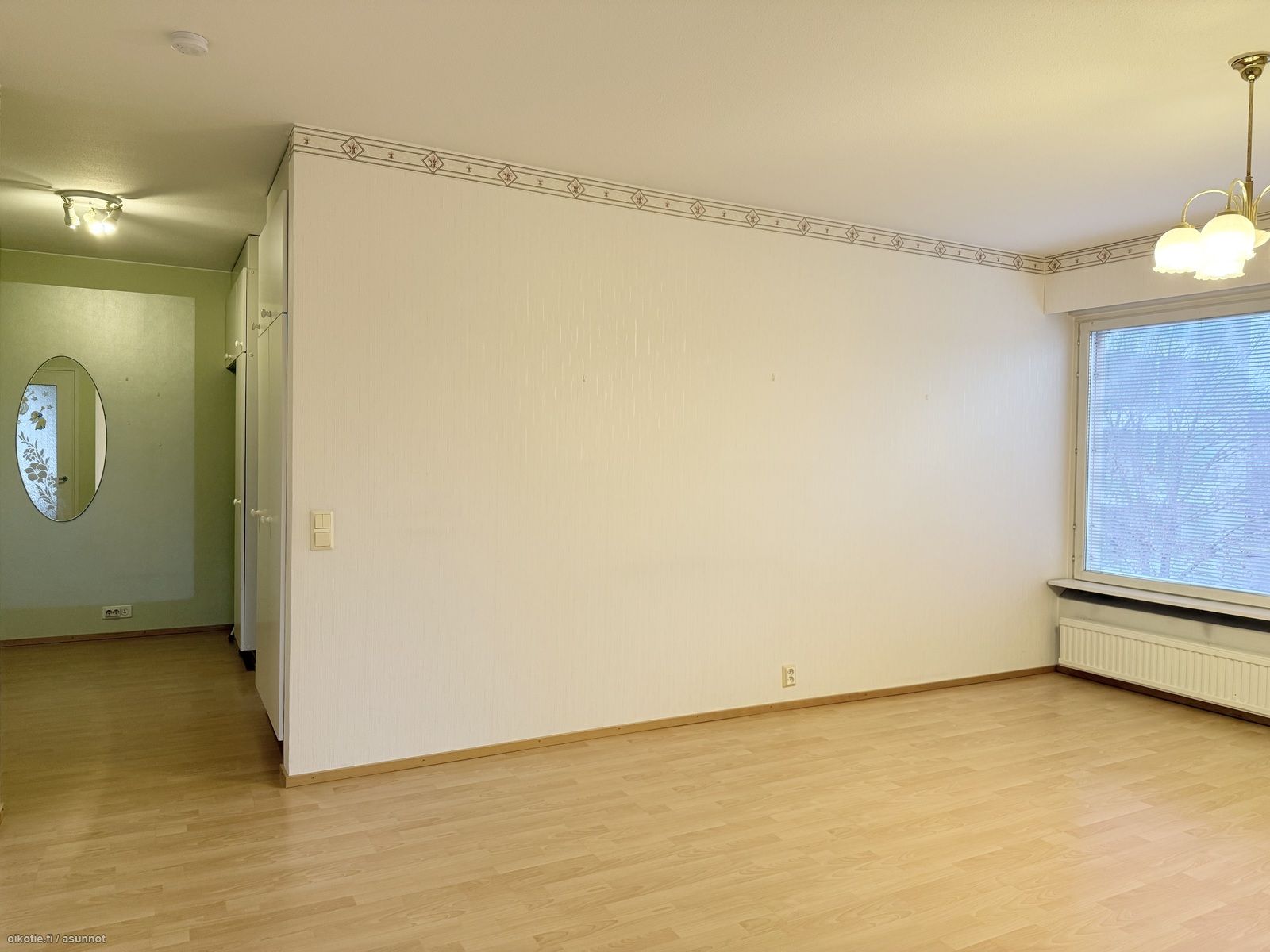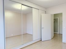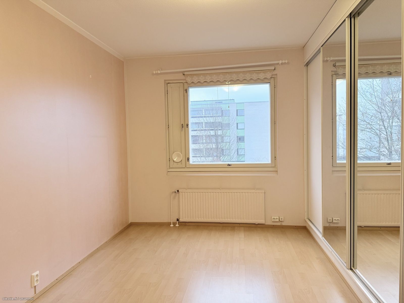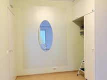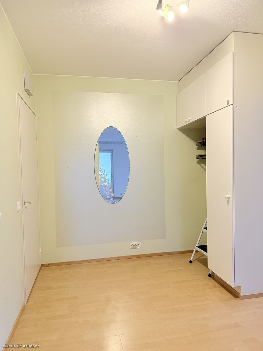 - Maalatut seinät (yksi seinistä maalattu helmiäismaalilla), laminaattilattia. Runsaasti liukuovikaapistoja.