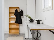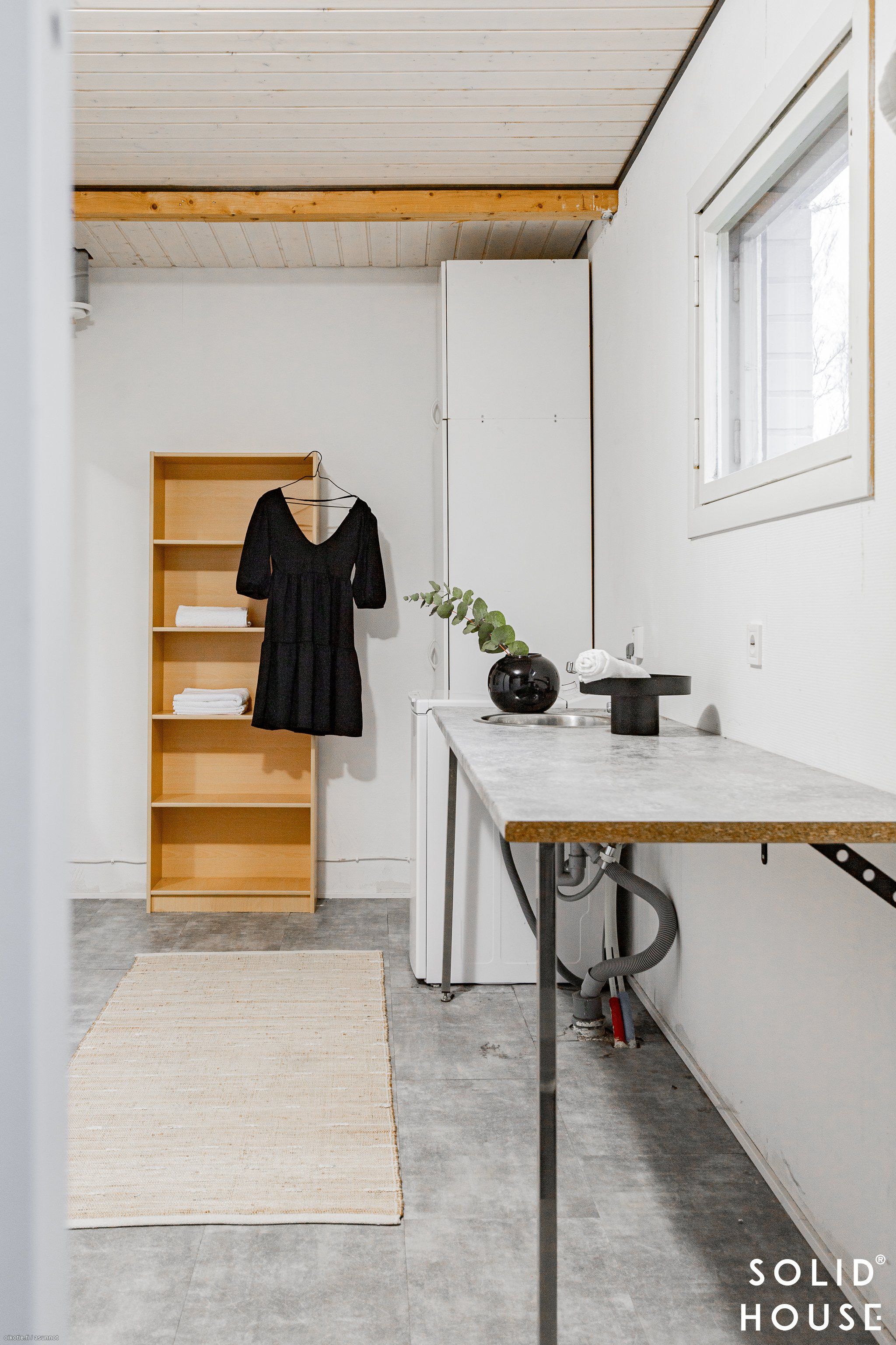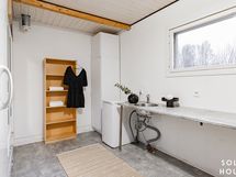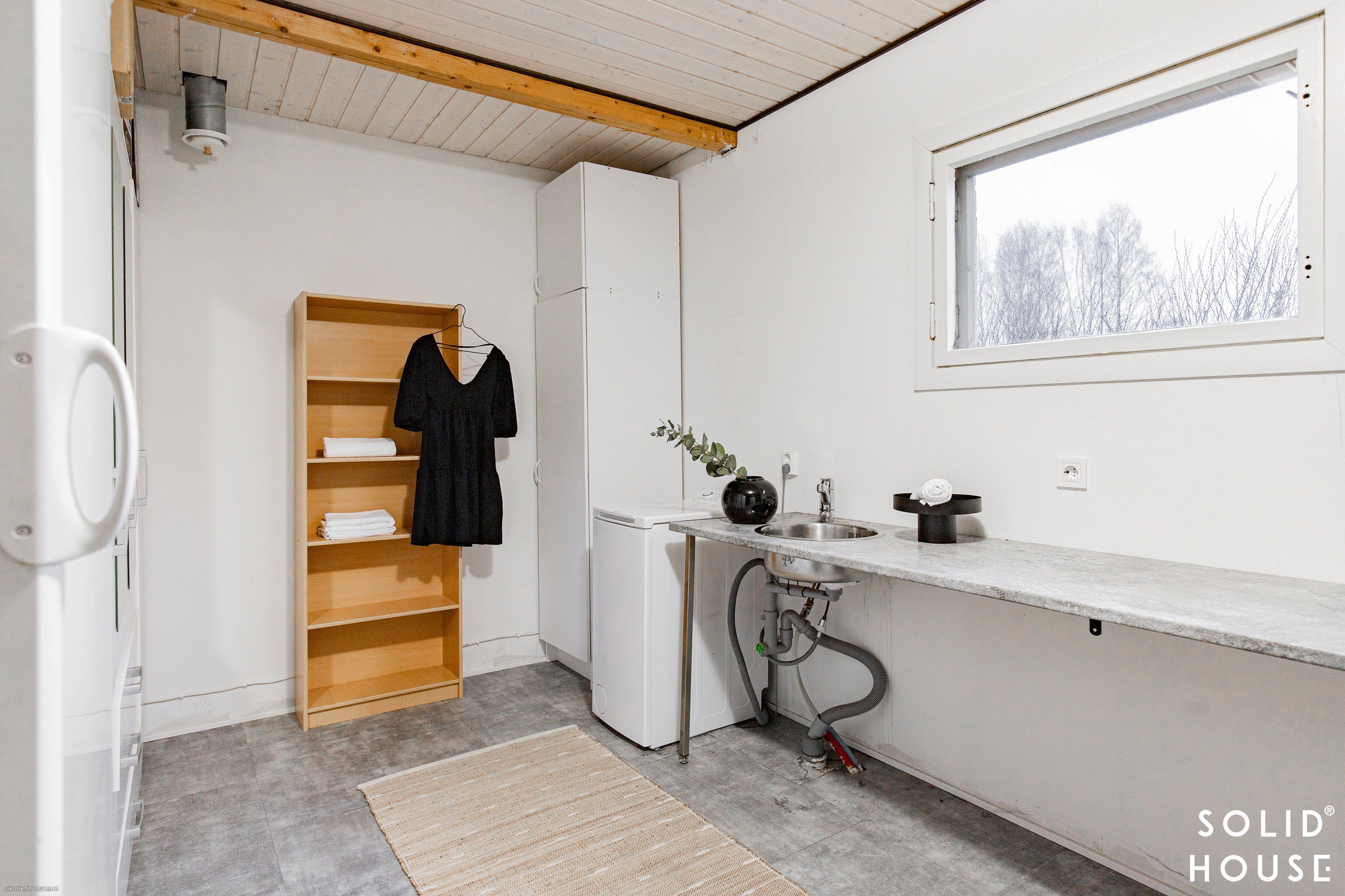 Kodinhoitohuoneessa on runsaasti säilytystilaa ja käytännöllisiä ratkaisuja, kuten lattialämmitys ja pesukoneliitäntä. Lisäksi erillinen wc tuo arkeen helppoutta.