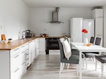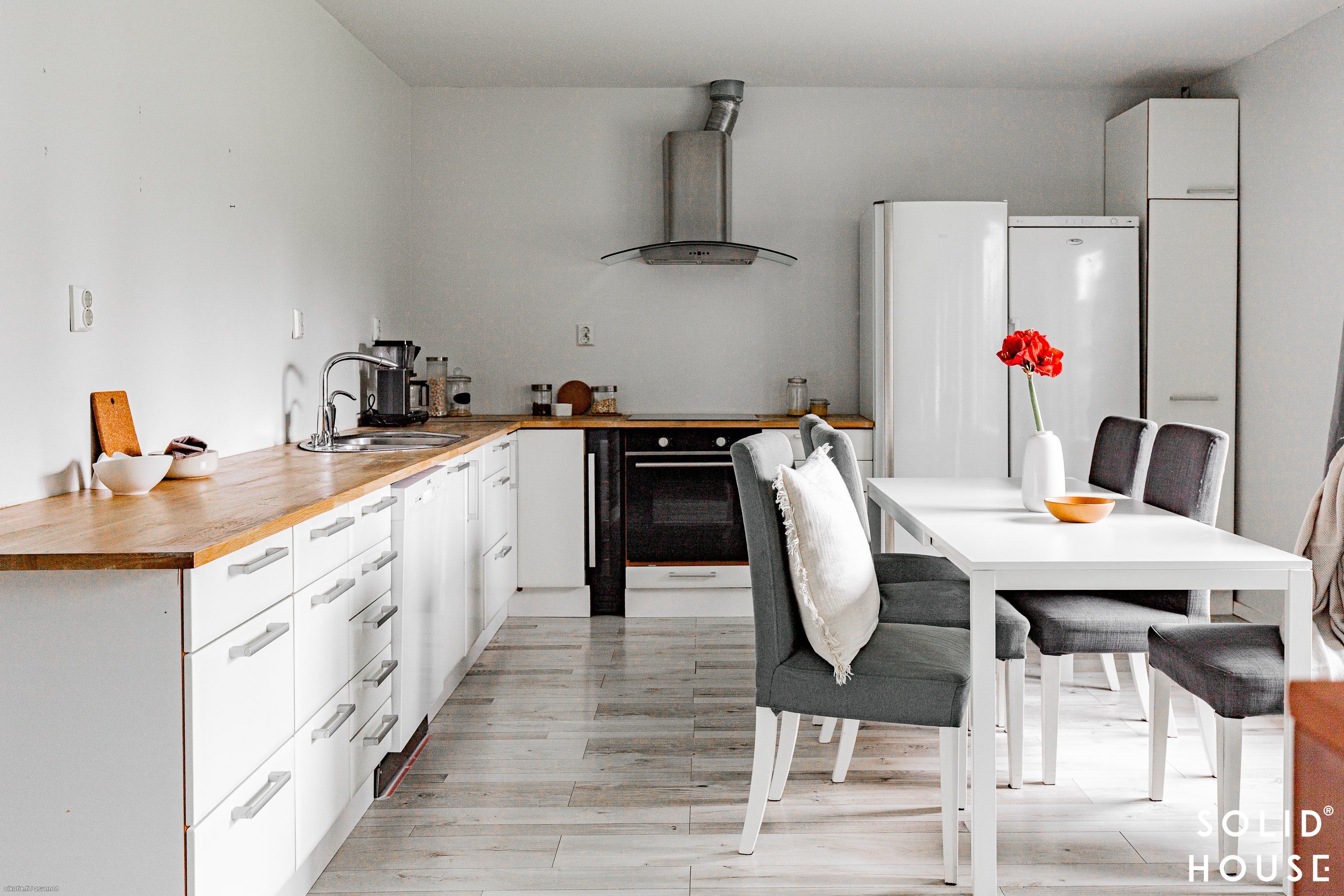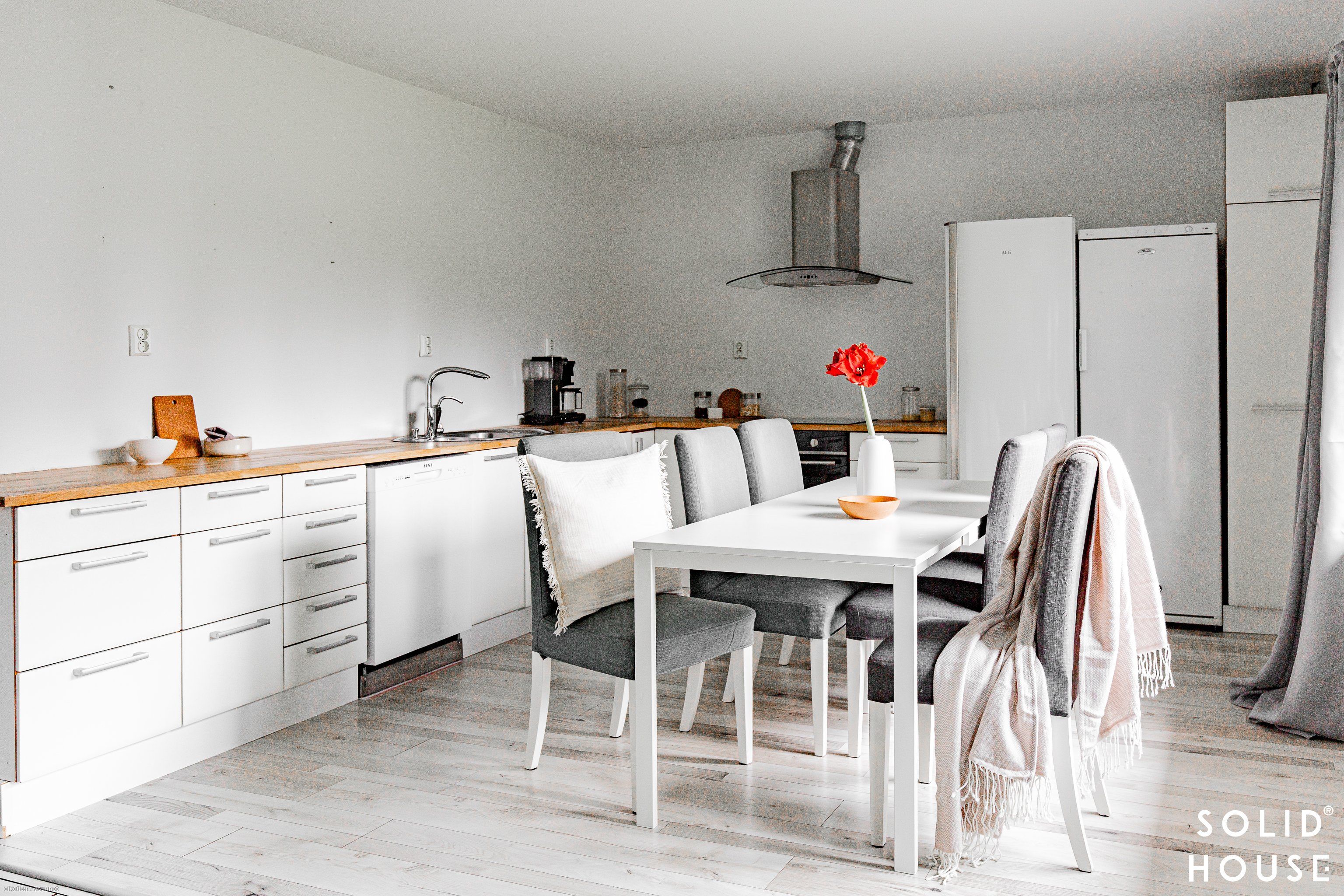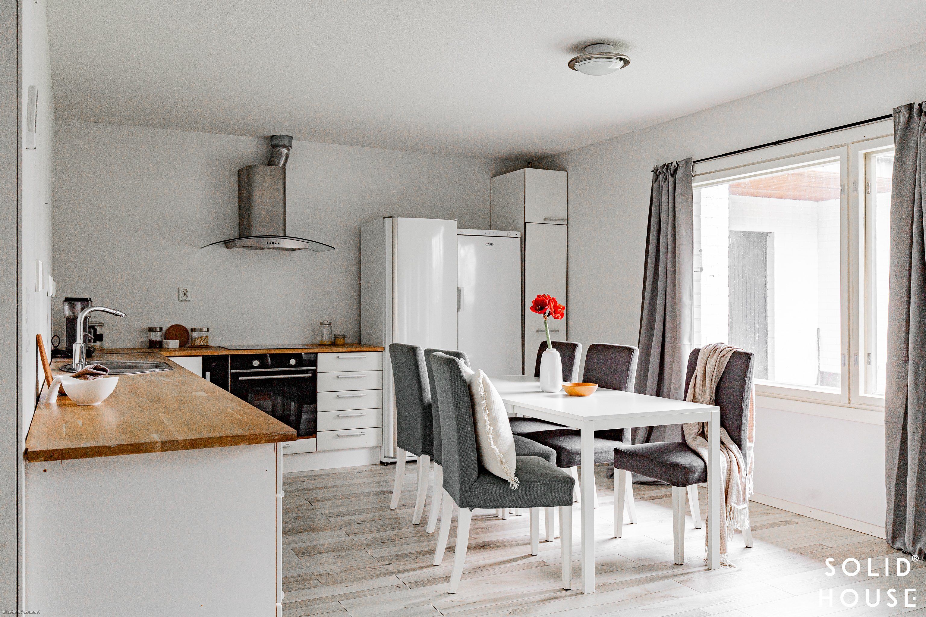 - Keittiön varusteet: Jääkaappi, erillinen pakastin, erillisuuni, liesi, liesituuletin ja astianpesukone. Liesi: Induktioliesi. Työtason materiaali: Laminaatti. Yläkaapiton keittiö on trendikäs valinta, joka luo avaran ja valoisan tunnelman, jossa suuremmankin perheen on mukava illallistaa.