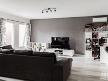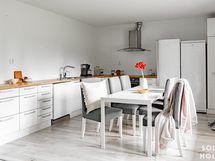 - Avonainen keittiö yhdistettynä suureen ja valoisaan olohuoneeseen jossa tilaa suuremmallekin perheelle. Jossa boheemia tunnelmaa kaunis harmaa struktuuri seinä. Keittiön ja olohuoneen välistä kulku metsäiseen pihamaisemaan.