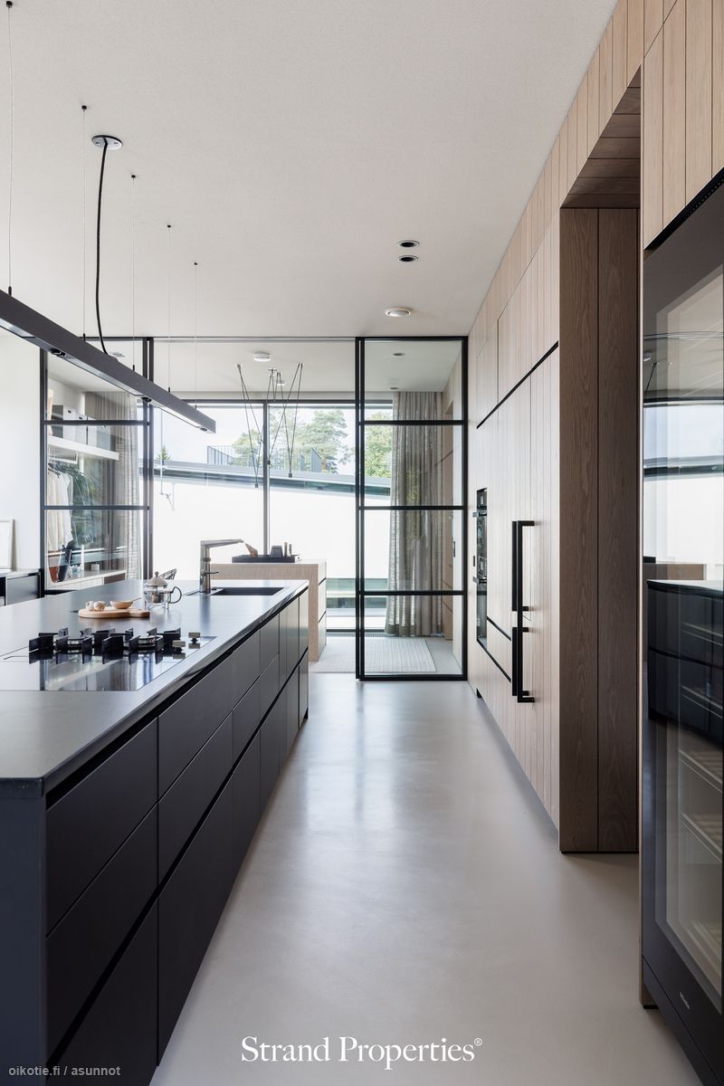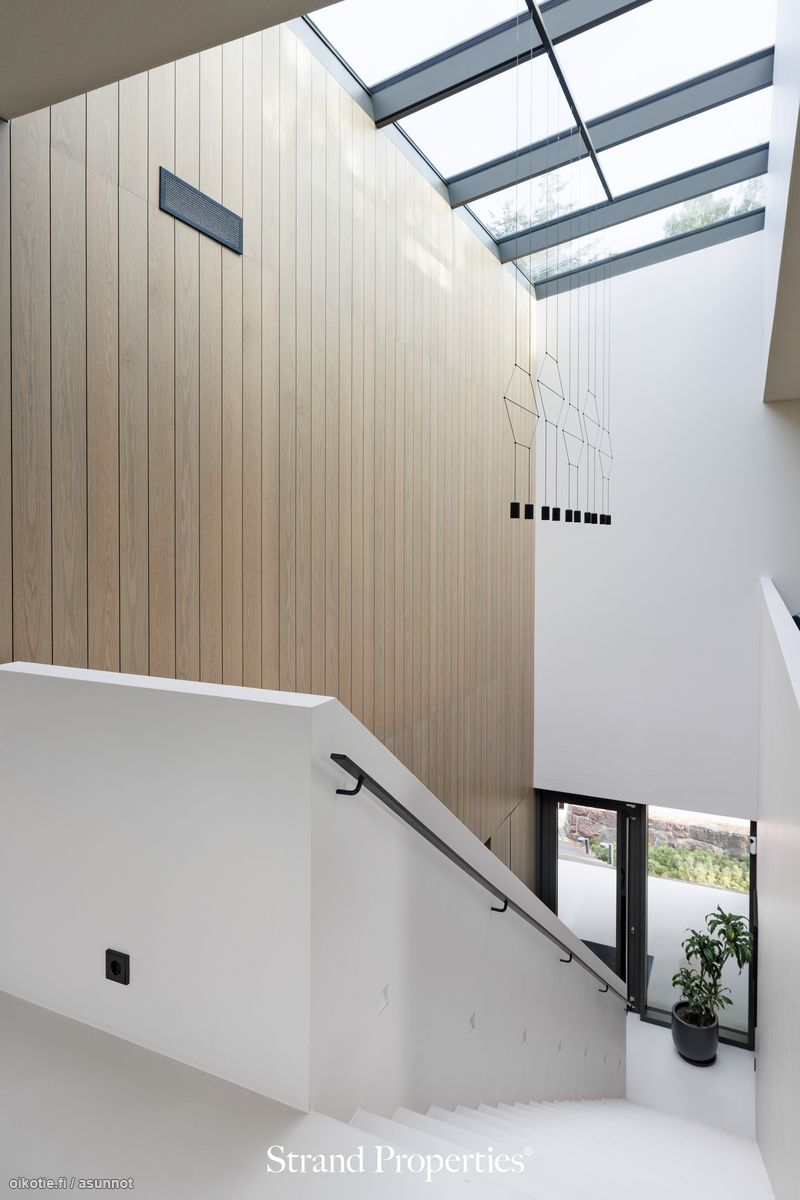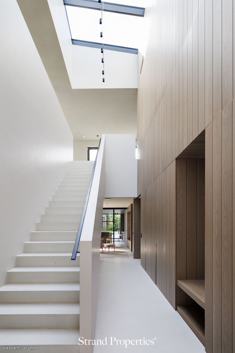 Tämä upea paikalleen valettu erillistalo on arkkitehdin todellinen taidonnäyte, jossa huippulaadukkaat materiaalit ja tyylikäs design yhdistyvät toiminnallisuuteen. Heti sisään astuessa kohtaa vaikuttavan valoisan sisäänkäynnin, jossa huonekorkeus on lähes 10 metriä, mikä luo ainutlaatuisen ja luomoavan vaikutelman.