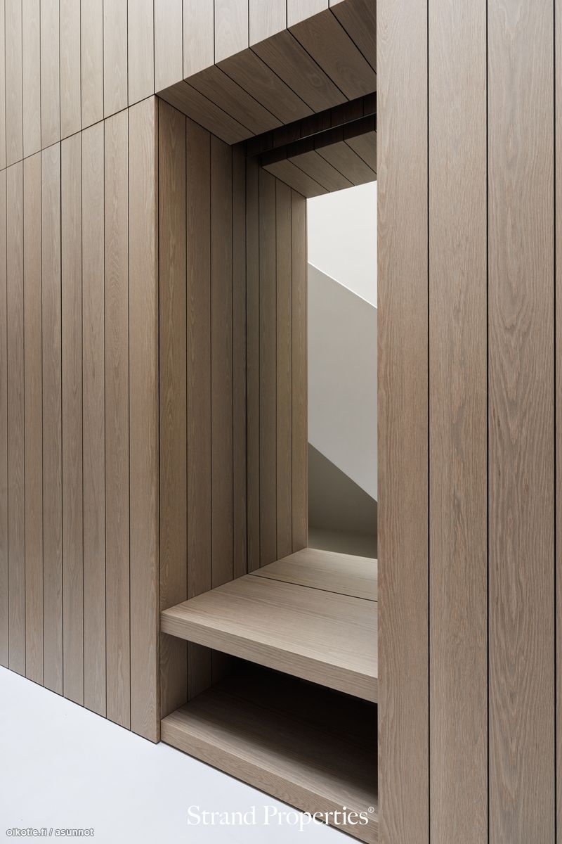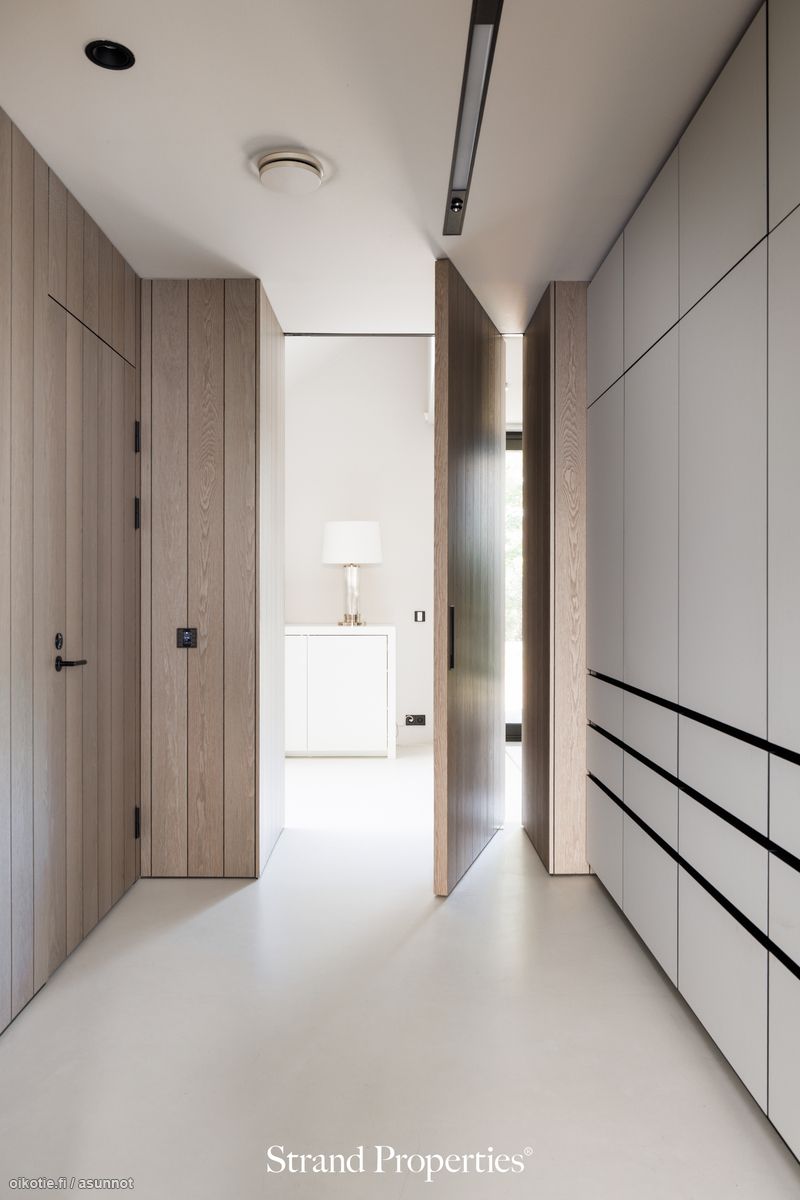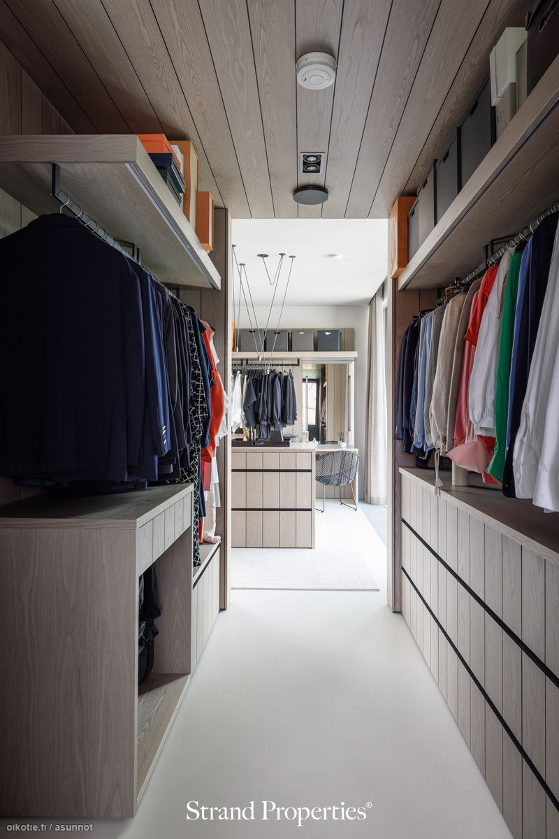 - Kirjasto / TV-huone alakerrassa. Lattiat mikrosementtiä, seinät maalattu/paneloitu. Ylellinen pukeutumishuone. Kiinteät puusepän suunnittelemat ja toteuttamat kaapistot.