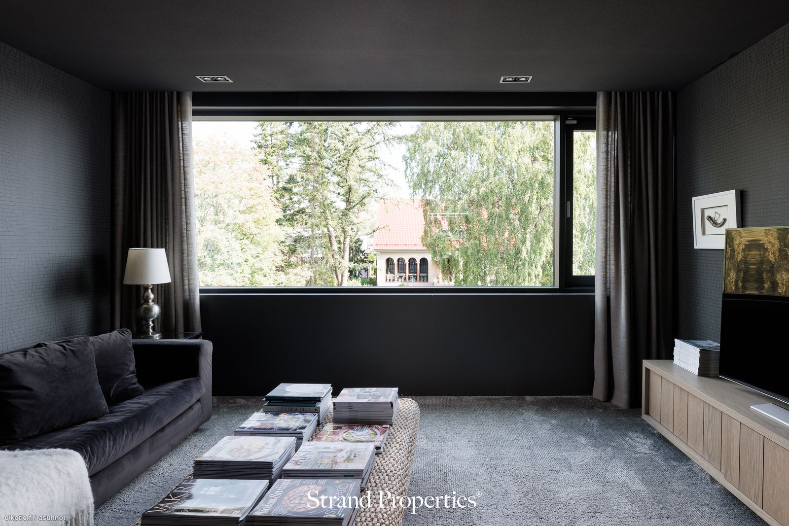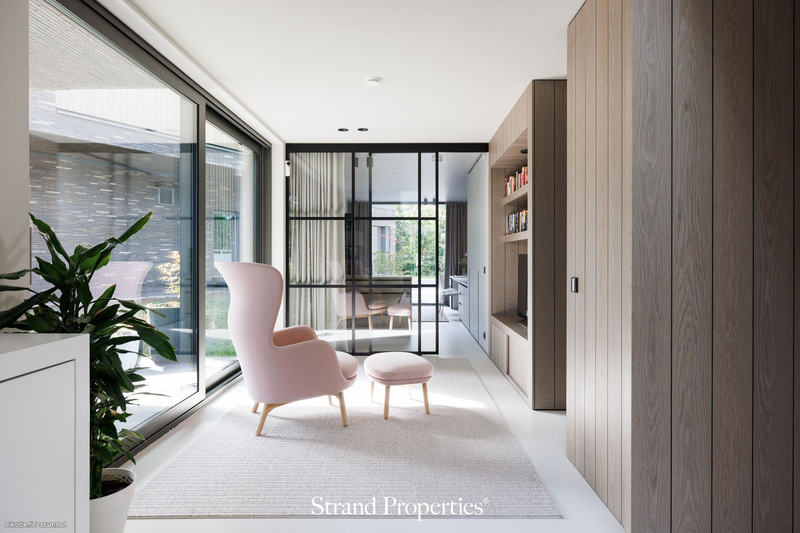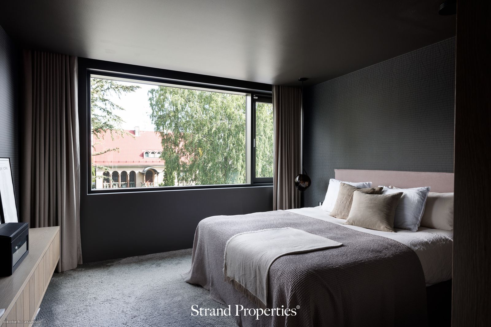 - Kirjasto / TV-huone alakerrassa. Lattiat mikrosementtiä, seinät maalattu/paneloitu. Ylellinen pukeutumishuone. Kiinteät puusepän suunnittelemat ja toteuttamat kaapistot.