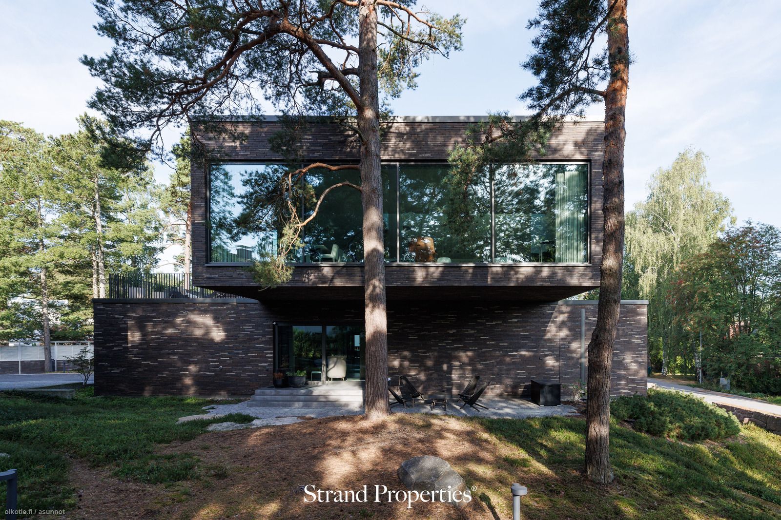Yläkerrassa avautuu valoa tulviva kaunis olohuone joka tarjoaa mitä kauneimmat näkymät upeine mäntyineen. Olohuoneen upea tila yhdistyy ylelliseen ja toimivaan avokeittiöön, josta avautuu lasioven kautta suuri eteläterassi, joka on täydellinen paikka myös illanviettoon pitkälle syksyyn asti. Yläkerran päämakuuhuoneen yhteydessä ylellisyyttä lisää valoisa pukeutumishuone. Talossa on käytössä kolme makuuhuonetta laadukkailla materiaaleilla ja tv-huone joka toimii hyvin myös makuuhuoneena. Talon tasokkaat puupaneeli seinät ja kaapistot on puusepän mestarillista käsityötä ja viimeistelyä. Suuret lattiasta kattoon ulottuvat ikkunat tuovat runsaasti luonnonvaloa sisään ja yhdistävät sisä- ja ulkotilat mitä upeimmalla tavalla. Kaikki ikkunat ja ovet Schukon, sävytetty arkkitehdin ohjeiden mukaisesti. Taidokkaasti säilytetyt männyt ympäröivät kotia, tuoden luonnon lähelle. Piha on suunniteltu helppohoitoiseksi ja sitä ympäröi alkuperäinen kaunis kivimuuri.