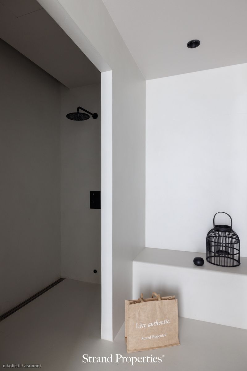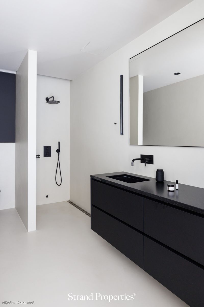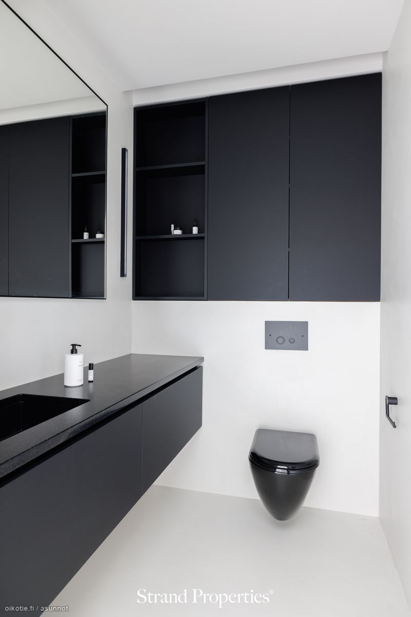 - Pesutilojen kuvaus: Yläkerran päämakuuhuoneen yhteydessä on tyylikäs kylpyhuone, jossa on runsaasti säilytystilaa, suihku, wc-istuin, allaskaappi ja peili. Alakerrasta löytyy erillinen kylpyhuone/spa -osasto, jossa tuplasuihku (sadesuihku), pesuallas ja höyrysauna. Kaikissa kylpyhuoneissa on upeat mustat Tapwell -merkkiset vesikalusteet. Lattiat mikrosementtiä, seinät mikrosementtiä. Erillisen WC:n kuvaus: Kaksi erillistä wc:tä. Pesuallas, peili, wc-istuin.