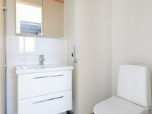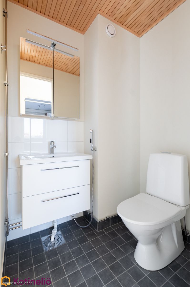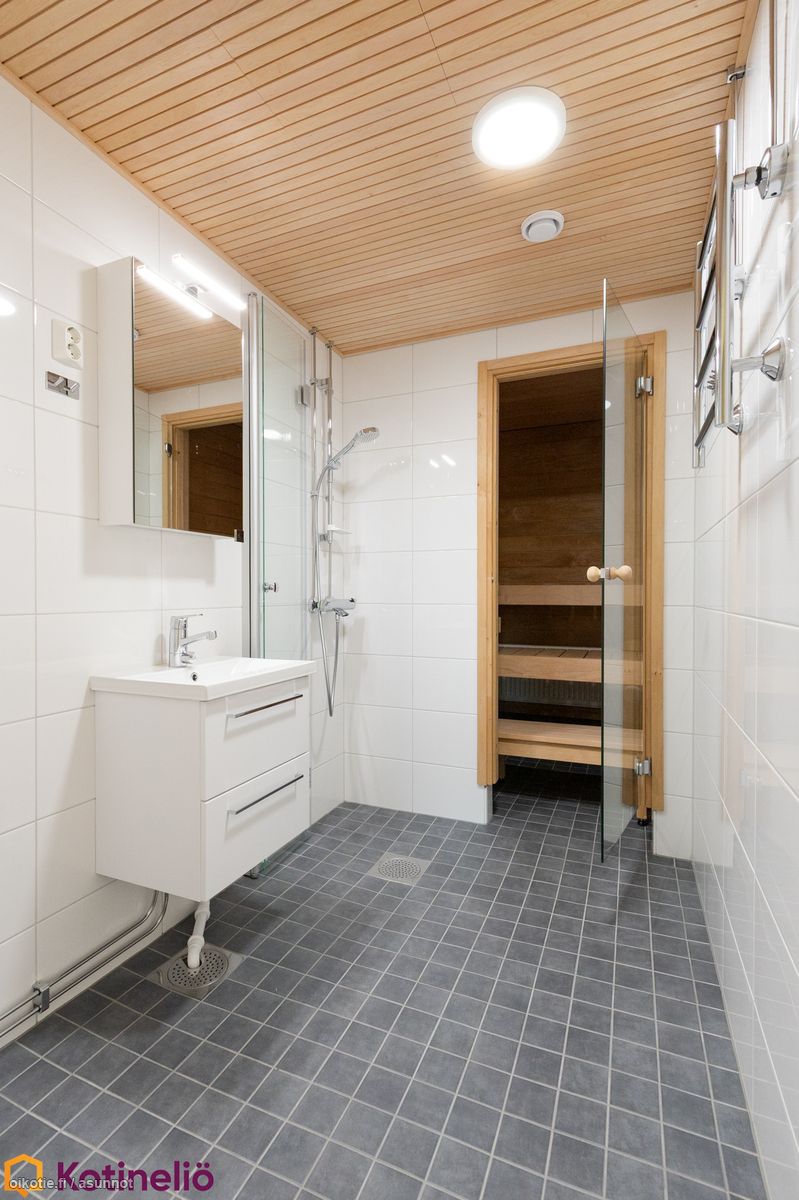 - Pesutilojen kuvaus: Kylpyhuone/sauna on käyttämätön, valmistunut LVIS-saneerauksessa 11/2025. Varustus: suihkuseinä, pesukoneliitäntä, suihku, peilikaappi, kiinteät valaisimet, kylpyhuonekaapisto. Erillisen WC:n kuvaus: laatikosto pesualtaan alla. Varustus: lattiakaivo, peilikaappi, bidee-suihku.