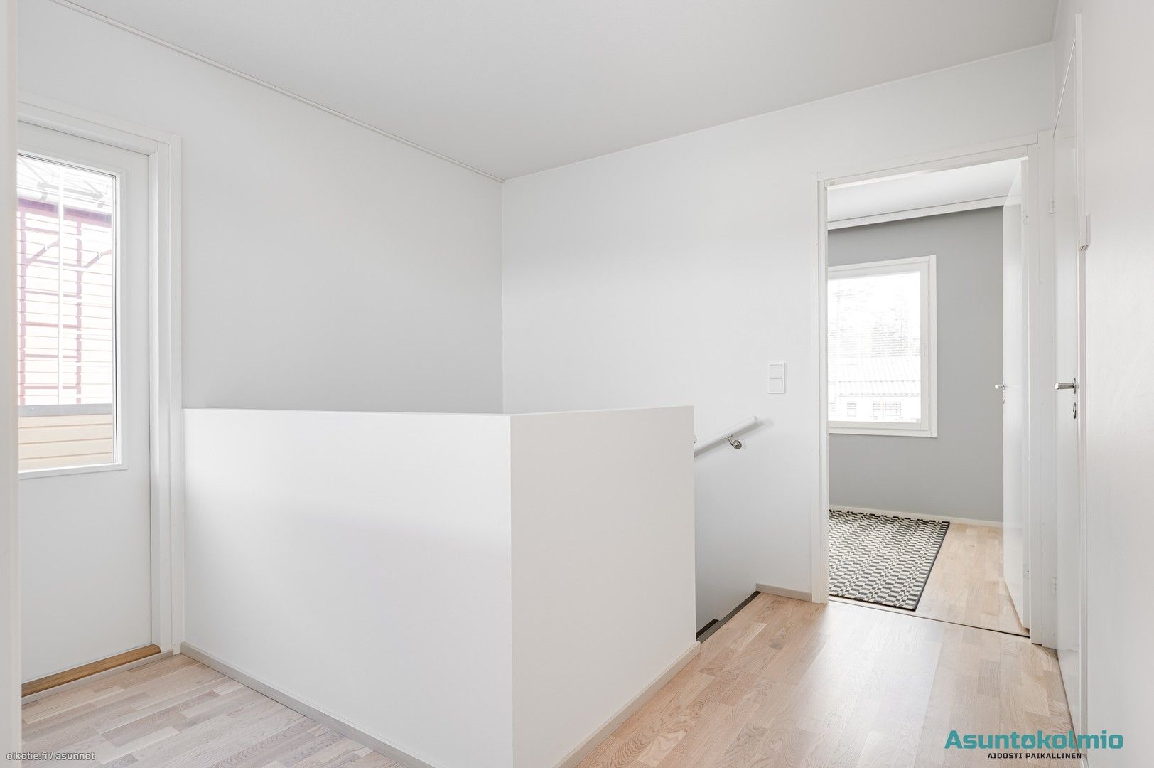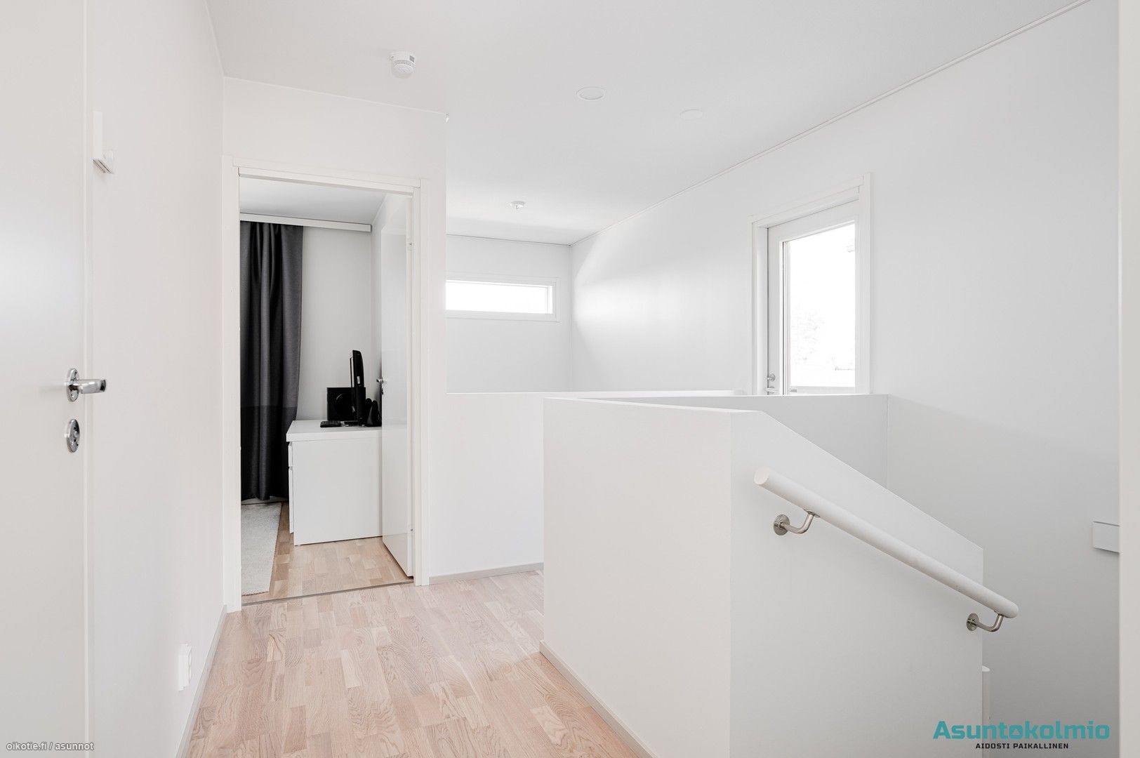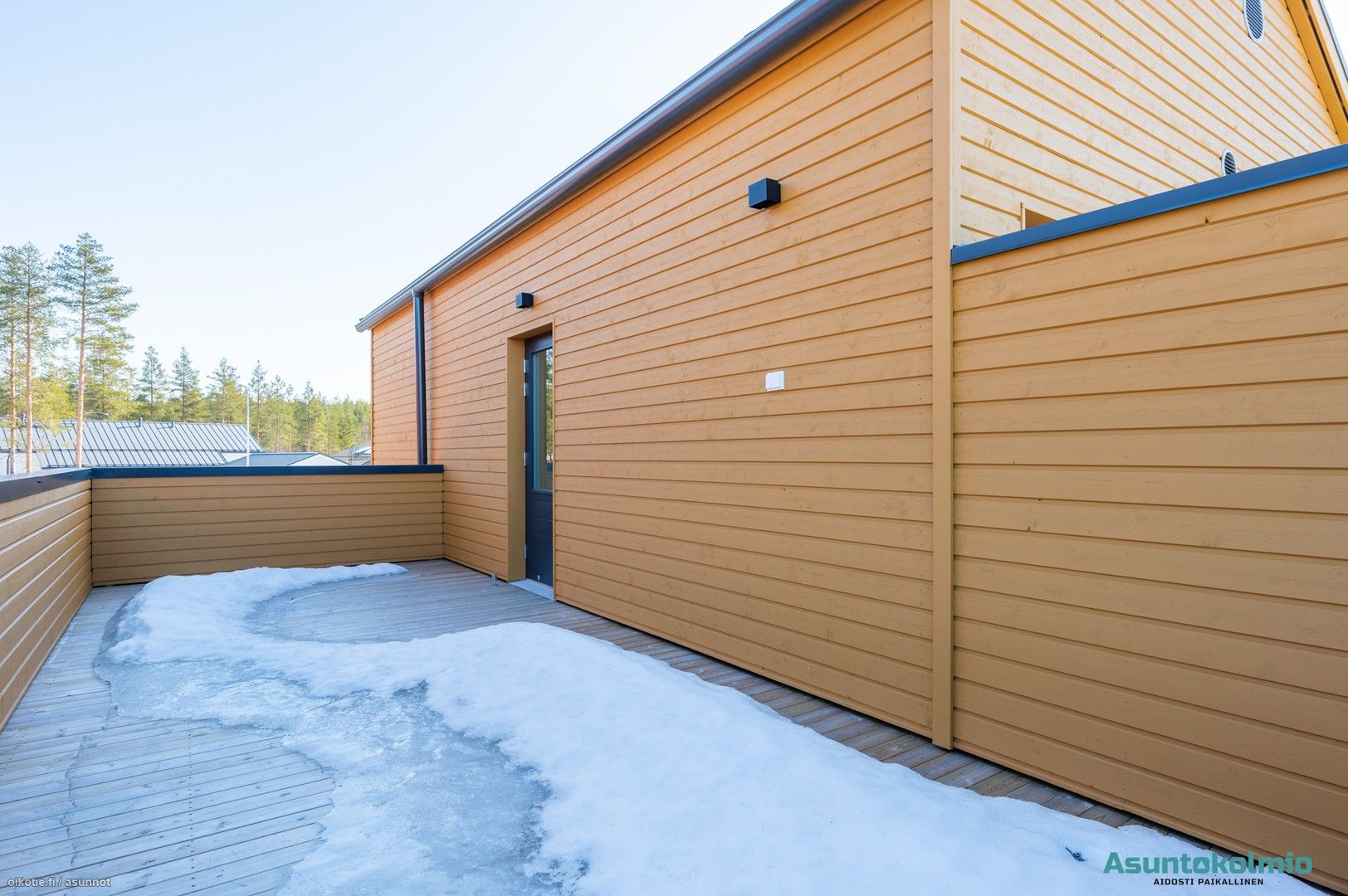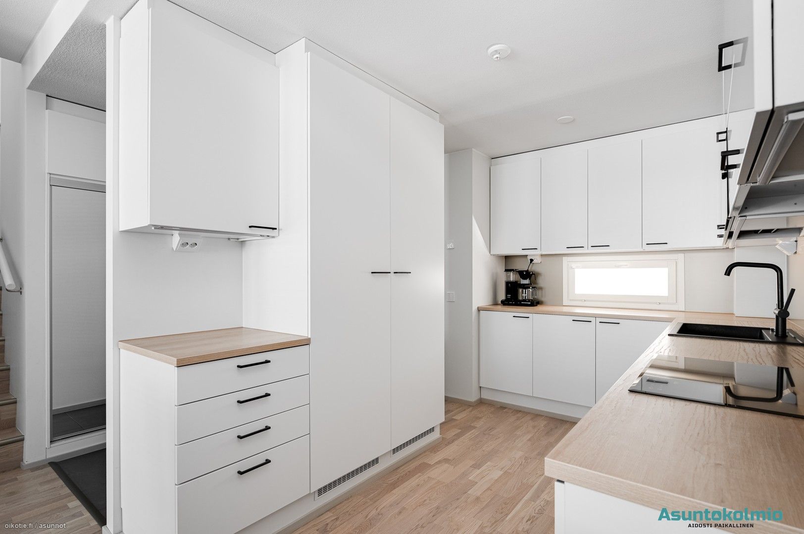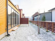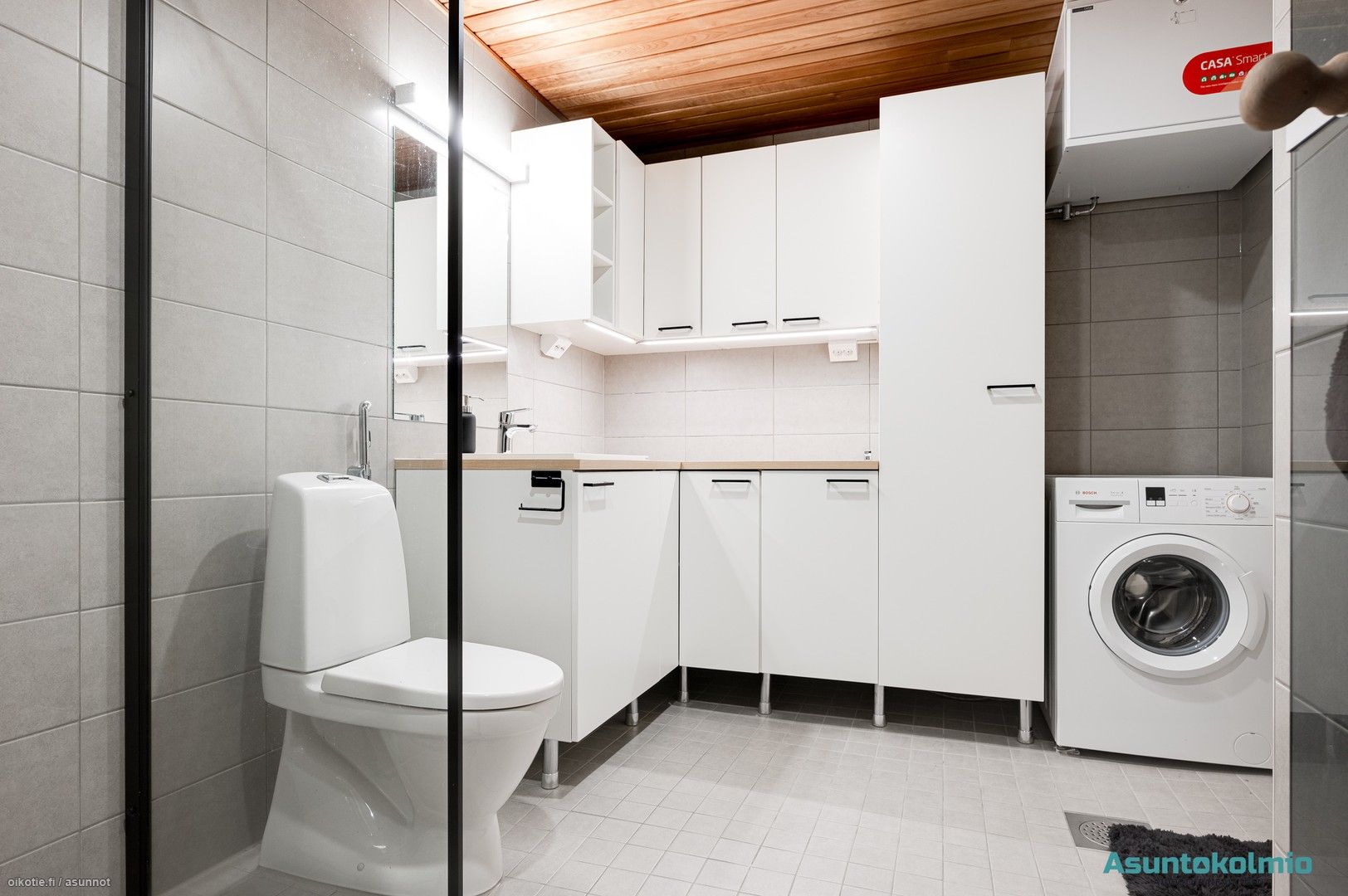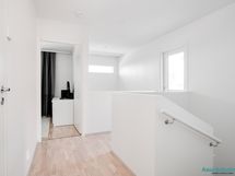 Alakerrassa on oma wc, jossa myös varaus suihkulle, ja yläkerrasta wc löytyy kylpyhuoneen yhteydestä. Kuivissa tiloissa on lattiamateriaalina laadukas valkolakattu tammiparketti, ja laadukkaan keittiön kodinkoneet ovat integroituja. Keittiöstä löytyy arkea sujuvoittamaan myös täyskorkeat jääkaappi- sekä pakastin, ja ylipäätään keittiössä on enemmän kaappi- ja laskutilaa, kuin juuri missään muussa vastaavan kokoisessa kolmiossa alueella. Aurinkoiselle lännen suuntaiselle lasitetulle terassille on kulku olohuoneesta ja yläaulasta pääsee hulppealle kattoterassille. Huoneiston edessä paikat autoille ja autokatoksessa valmiina myös voimavirtapistoke sähköauton lataamiseen. Reilun kokoinen 7m2 varasto sijaitsee myös autokatoksen päässä.