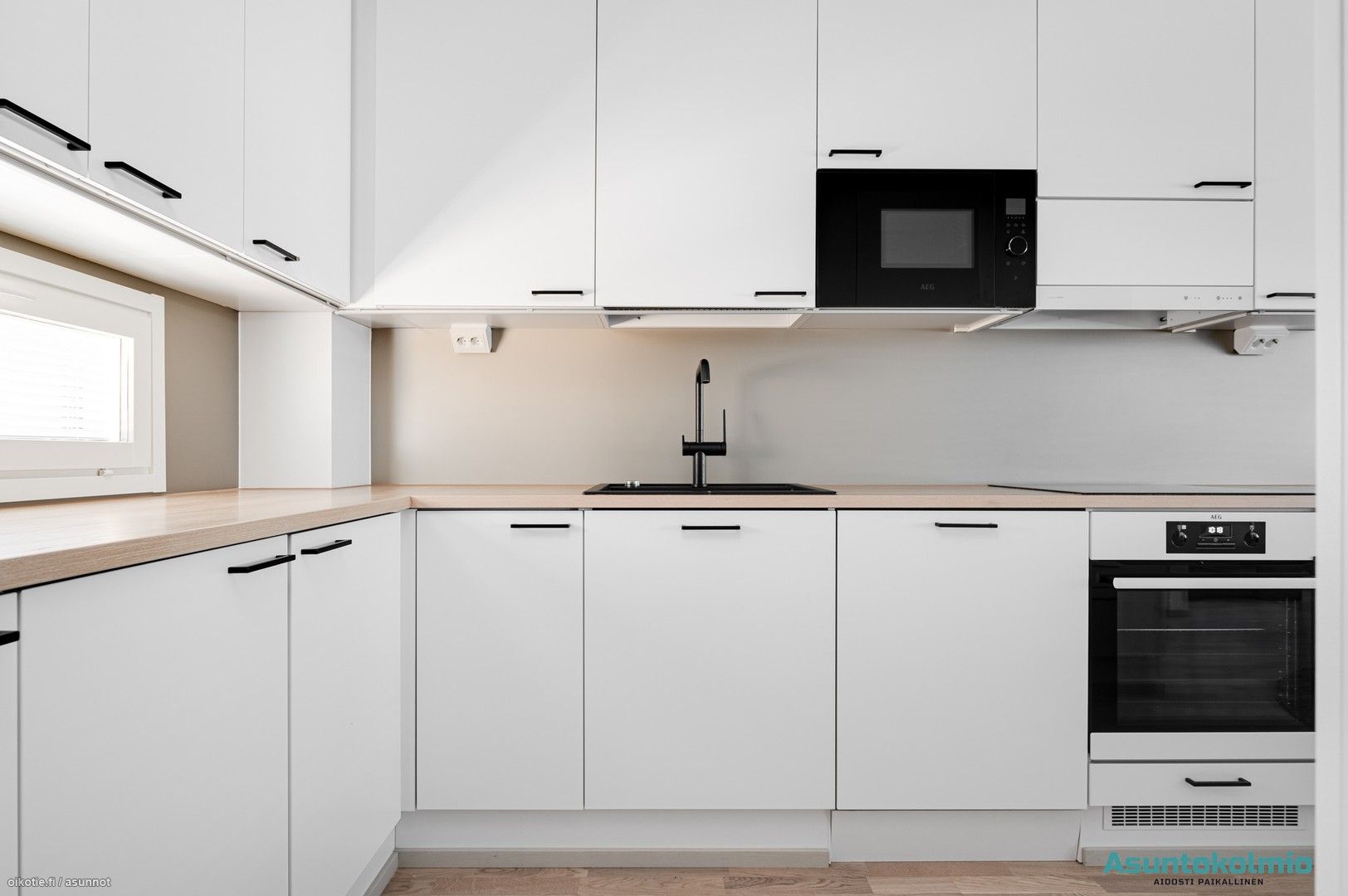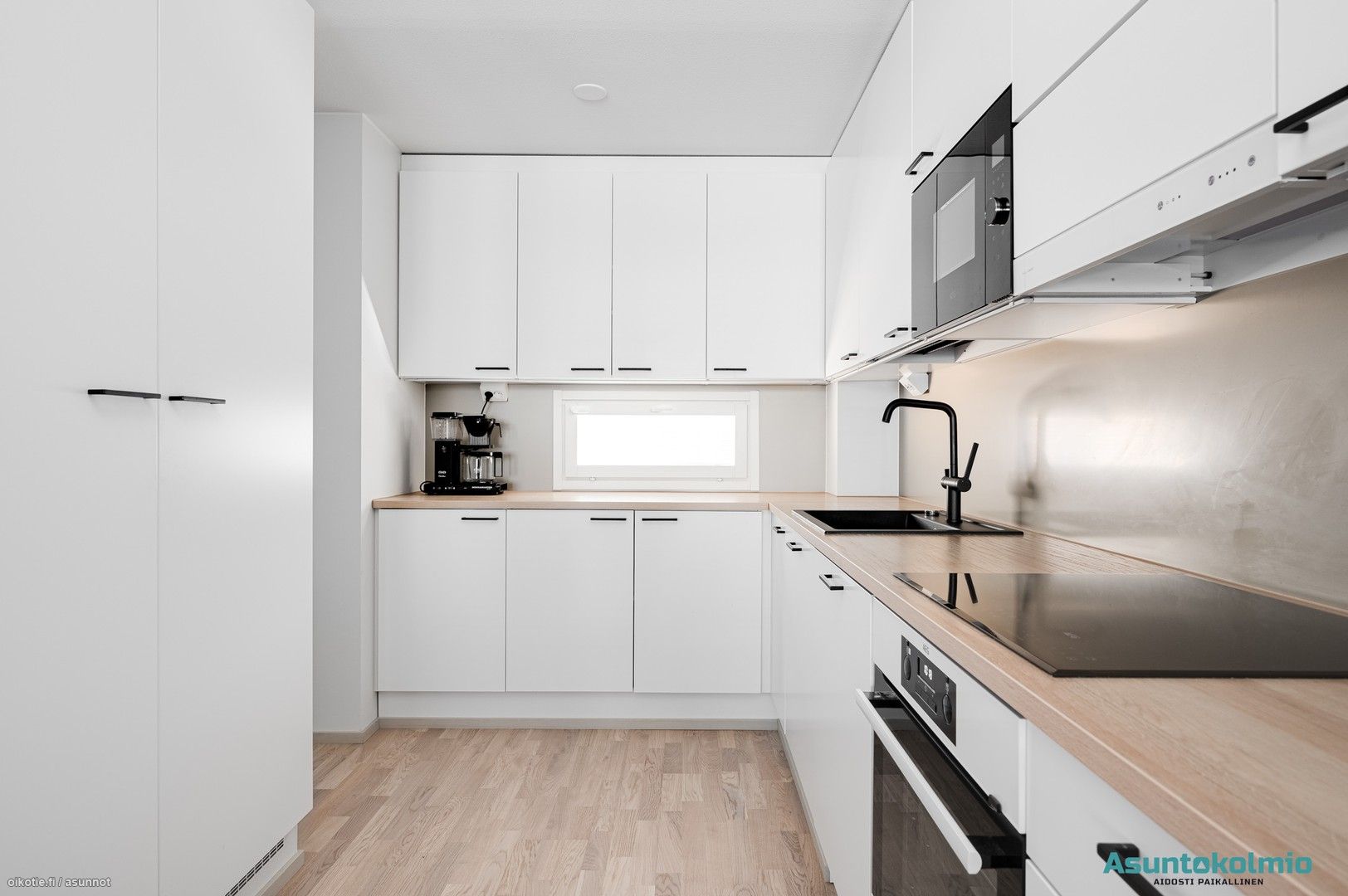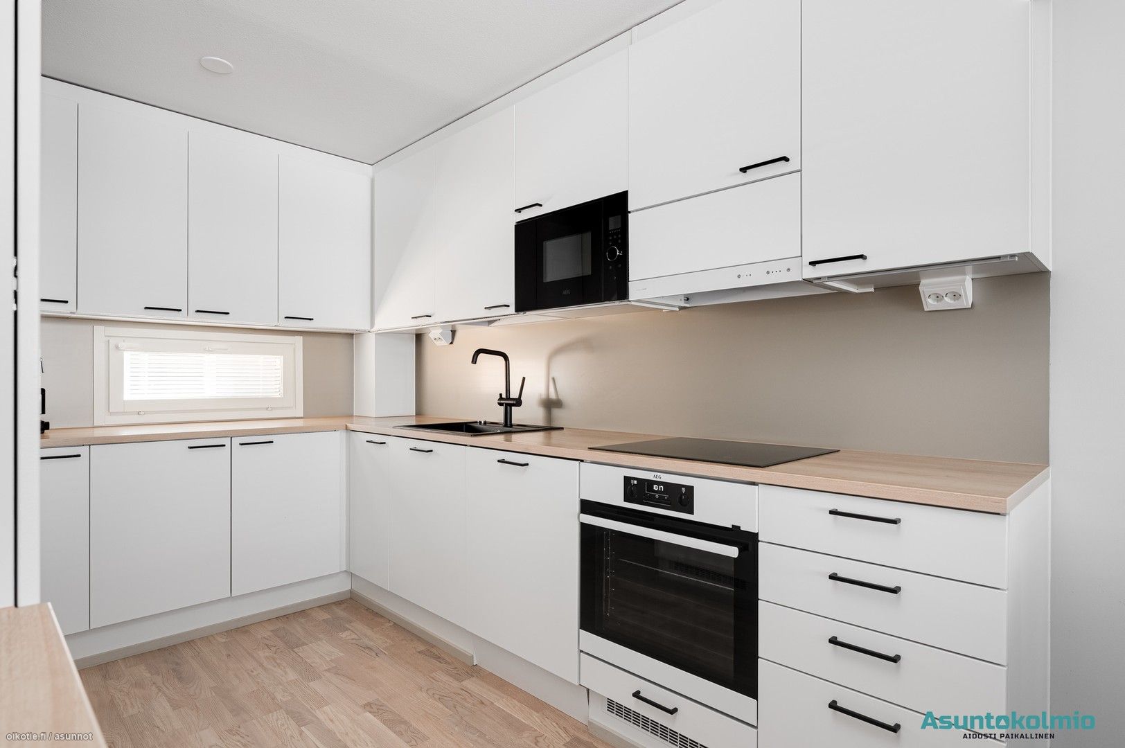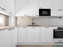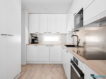 - integroitu jääkaappi, integroitu pakastin, integroitu astianpesukone, integroitu mikro, induktiotaso, erillisuuni, liesituuletin, laminaattitasot.