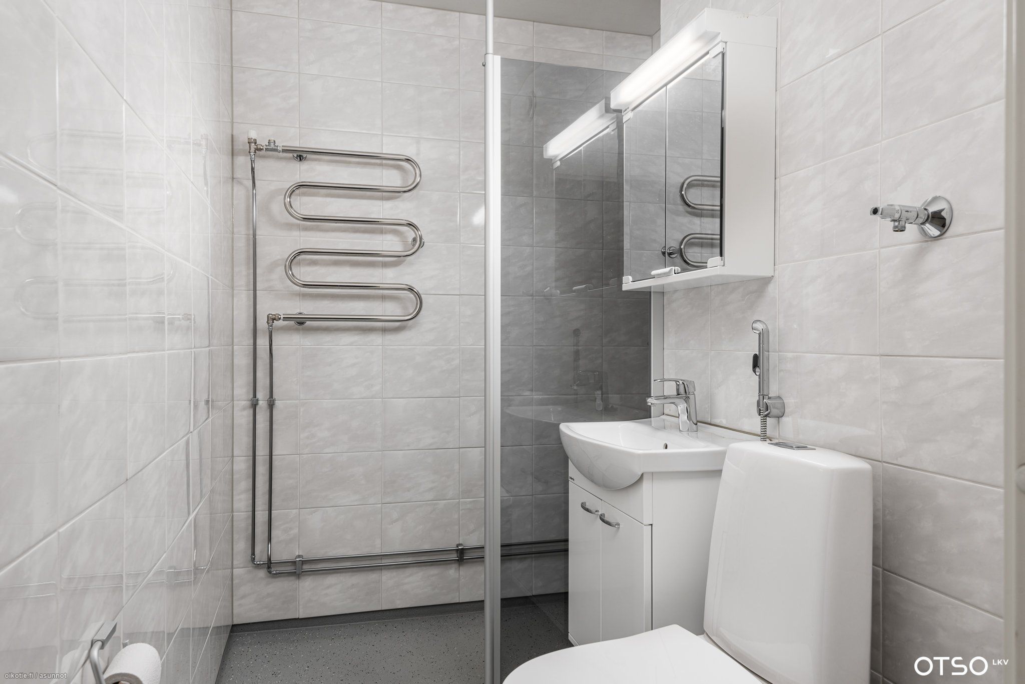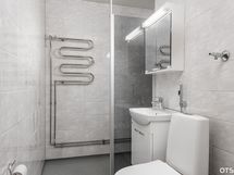 - Pesutilojen varusteet: WC-istuin, suihku, suihkuseinä, peilikaappi, allaskaappi, bidee-suihku, pesukoneliitäntä, pesuallas ja pyyhekuivain patteri.