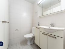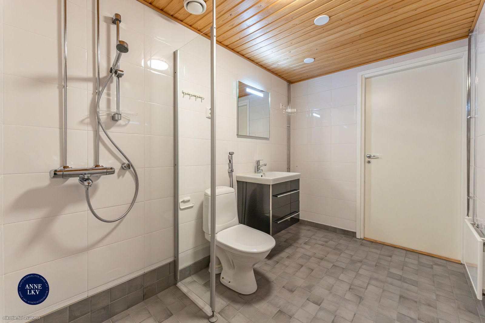 - Pesutilojen kuvaus: Seinät ja lattia laatoitettu, lattialämmitys (sähkö), puupaneelikatto, pesukoneliitäntä (tilavaraus pesutornille), allas ja -laatikosto (2020), valopeili, wc, bidesuihku, lasisuihkuseinä, suihku, lämpöpatteri, pyyhekoukut. . Erillisen WC:n kuvaus: Erillisessä wc.ssä korkeat kaapit, kylpyhuonekaluste (alakaapit, allas, hana), peilikaappi, wc, bidesuihku, pyyhekoukut, seinät ja lattia laatoitettu, lattialämmitys (sähkö). Toinen wc kylpyhuoneessa.