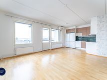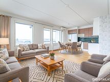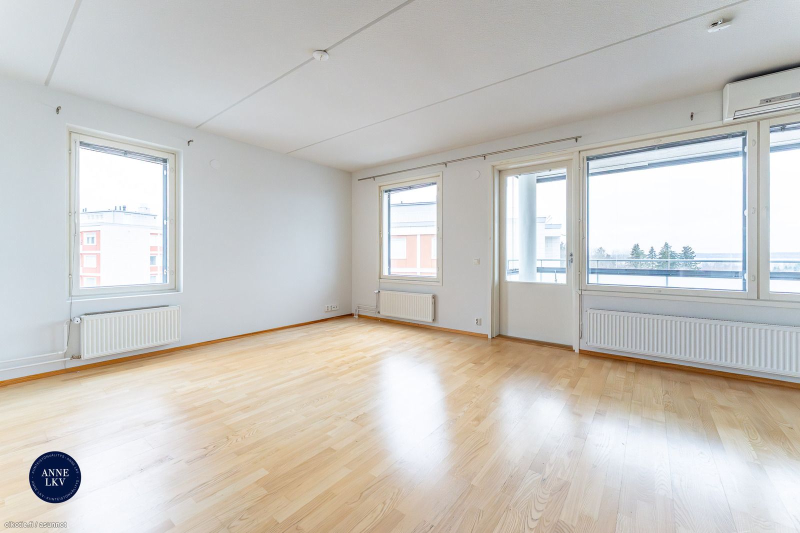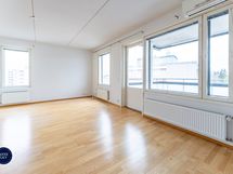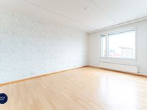 - Olohuoneessa ikkunat etelä-länsi -suuntiin, käynti isolle lasitetulle länsiparvekkeelle. Ikkunoista avarat näkymät. Seinäpinnat maalattu, parkettilattia. Avokeittiö on yhteydessä olohuoneeseen.