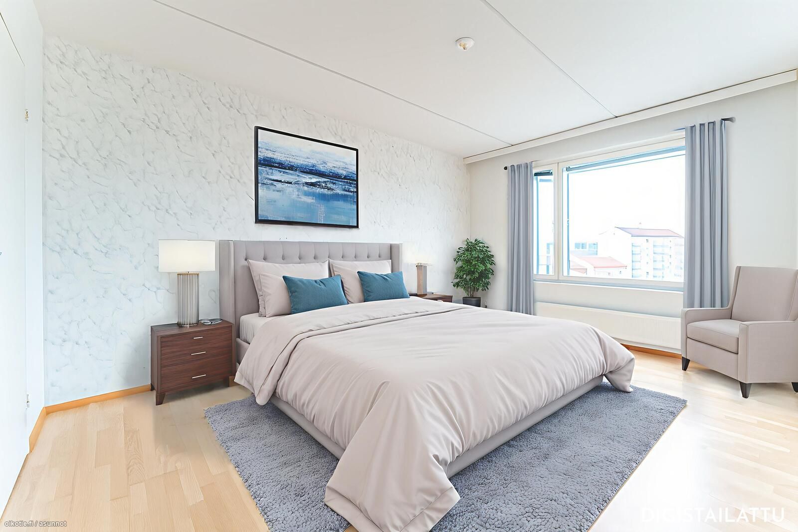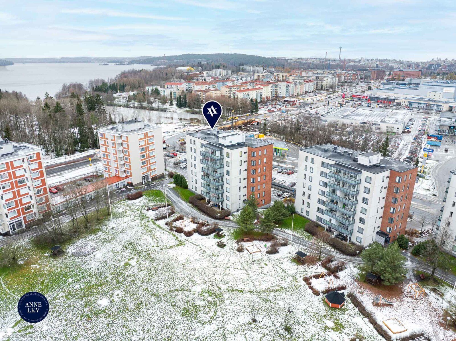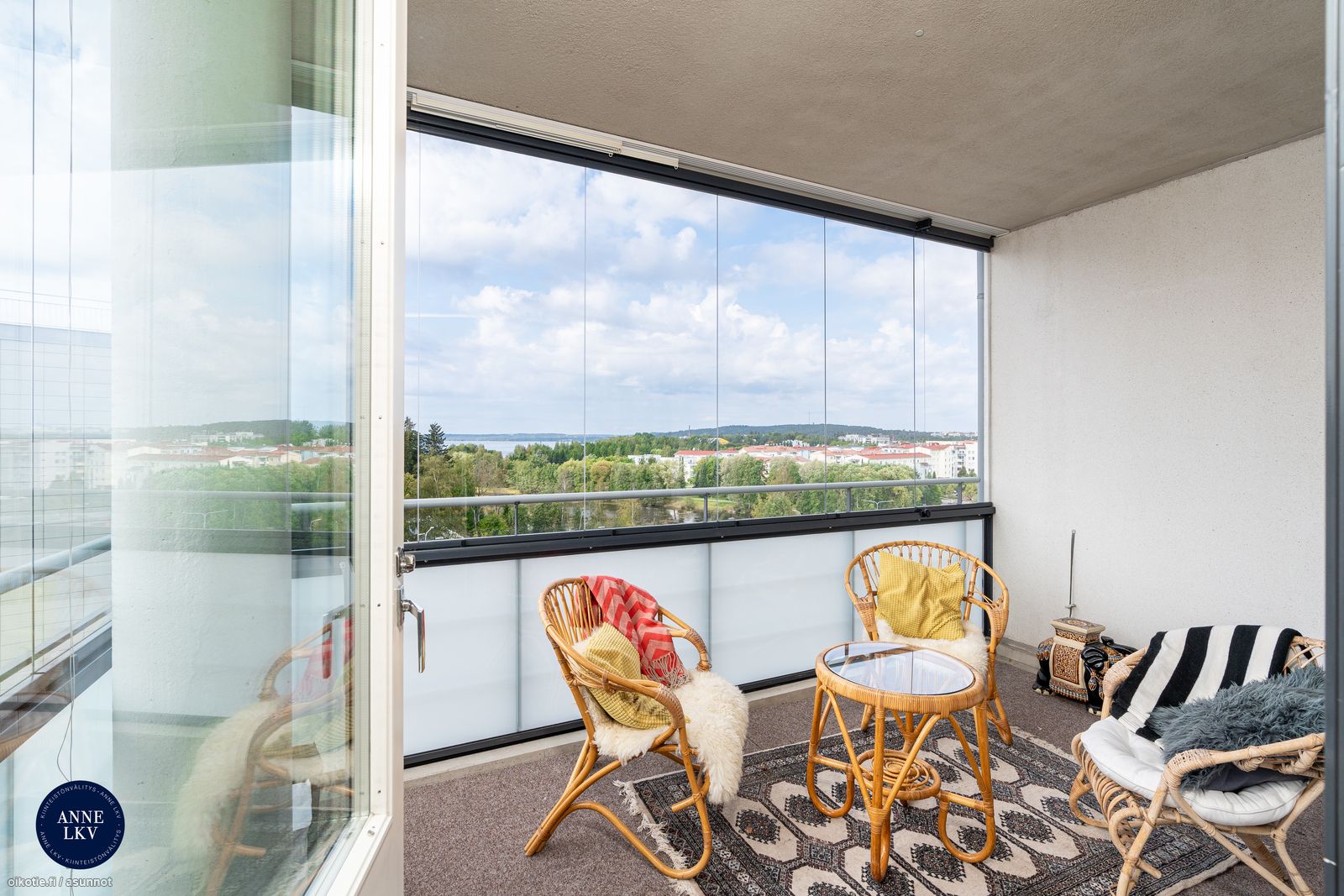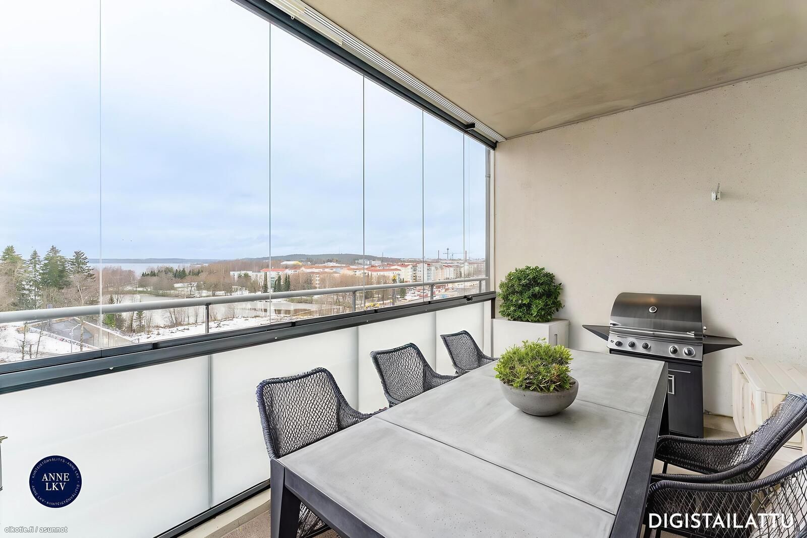 Rakenteilla olevan ratikkareitin varrella, 7. kerroksessa sijaitseva valoisa ja toimivapohjainen kaupunkikoti hurmaa avarilla maisemillaan. Noin 10 m² lasitetulta länsiparvekkeelta avautuvat upeat näkymät Näsinneulalle, Pyynikin näkötornille, Pyhäjärvelle ja aina Nokialle asti. Parveke toimii loistavasti lisätilana ympäri vuoden.